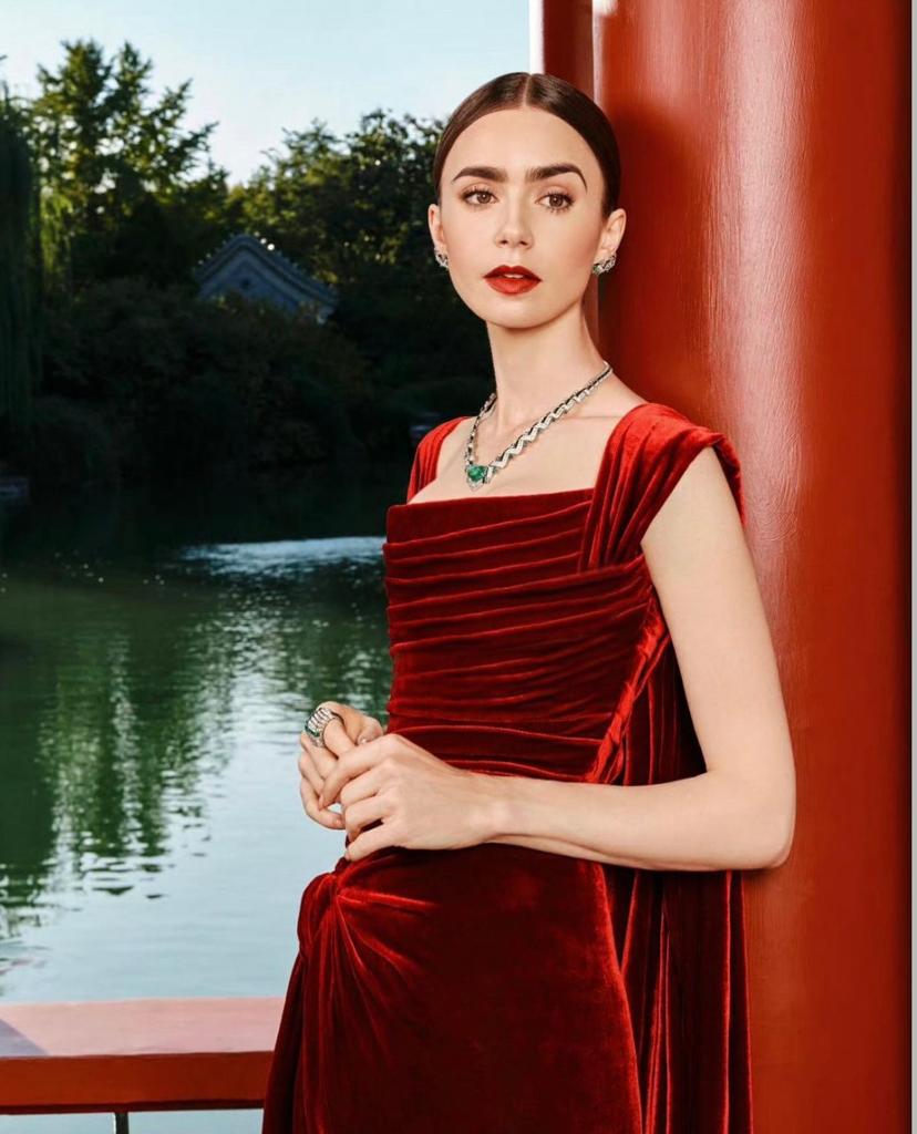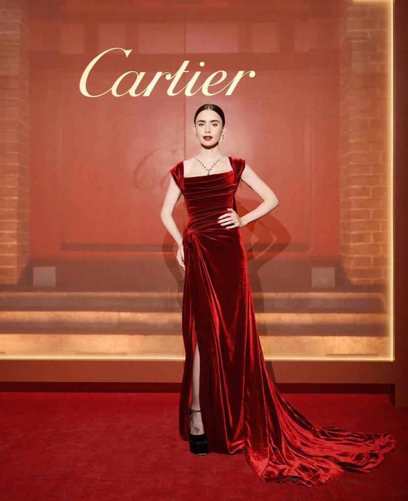 في حفل Cartier الذي أقيم في بكين أواخر الشهر الفائت، بدت الممثّلة الشابة ليلي كولينز أنيقة جداً بفستان من المخمل بلون الأحمر البرغندي من مجموعة الخياطة الراقية لخريف وشتاء 2023، مميّز بقصّة طويلة ومنسدلة مع خصر محدّد، وبدون كُمّيْن، بتفصيل شقّ طويل يكشف السّاق، وذيل ينساب على طول الفستان من الخلف، أقرنته مع مضخّة سوداء بمنصّة ضخمة من Valentino، وتزيّنت بمجوهرات مرصّعة بالماس والزمرّد من Cartier.