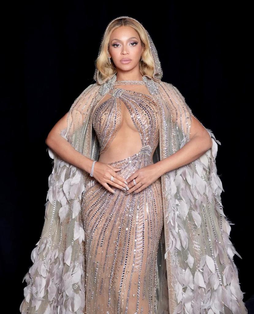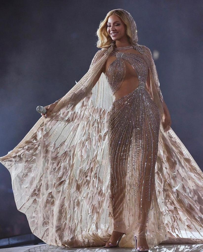 خلال جولة Renaissance الغنائيّة حول العالم، تألقّت بيونسيه بأكثر من تصميم لافت بتوقيع إيلي صعب، وأجملهم كان الذي اختارته من مجموعة خريف وشتاء 2023 في الحفل الذي أقامته في سياتل في شهر سبتمبر الماضي، وهو فستان شفّاف مطرّز بالكامل بالخرز والترتر والكريستال الفضّي، بقصّة طويلة ذات كتف واحدة، ومكشوف على طول الصدر والظهر، كما أنه مقرون مع رداء كتفيْن بتفصيل غطاء للرأس، وهو مطرّز بنمط الفستان ومزيّن بالريش، وانتعلت معه صندلاً فضّي اللون.