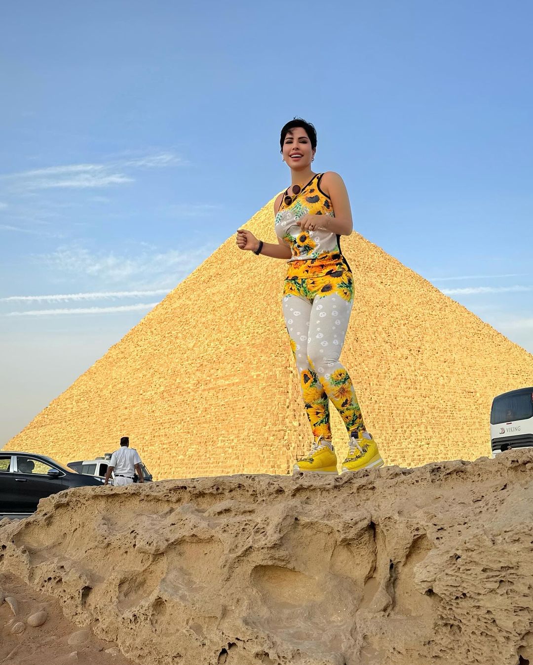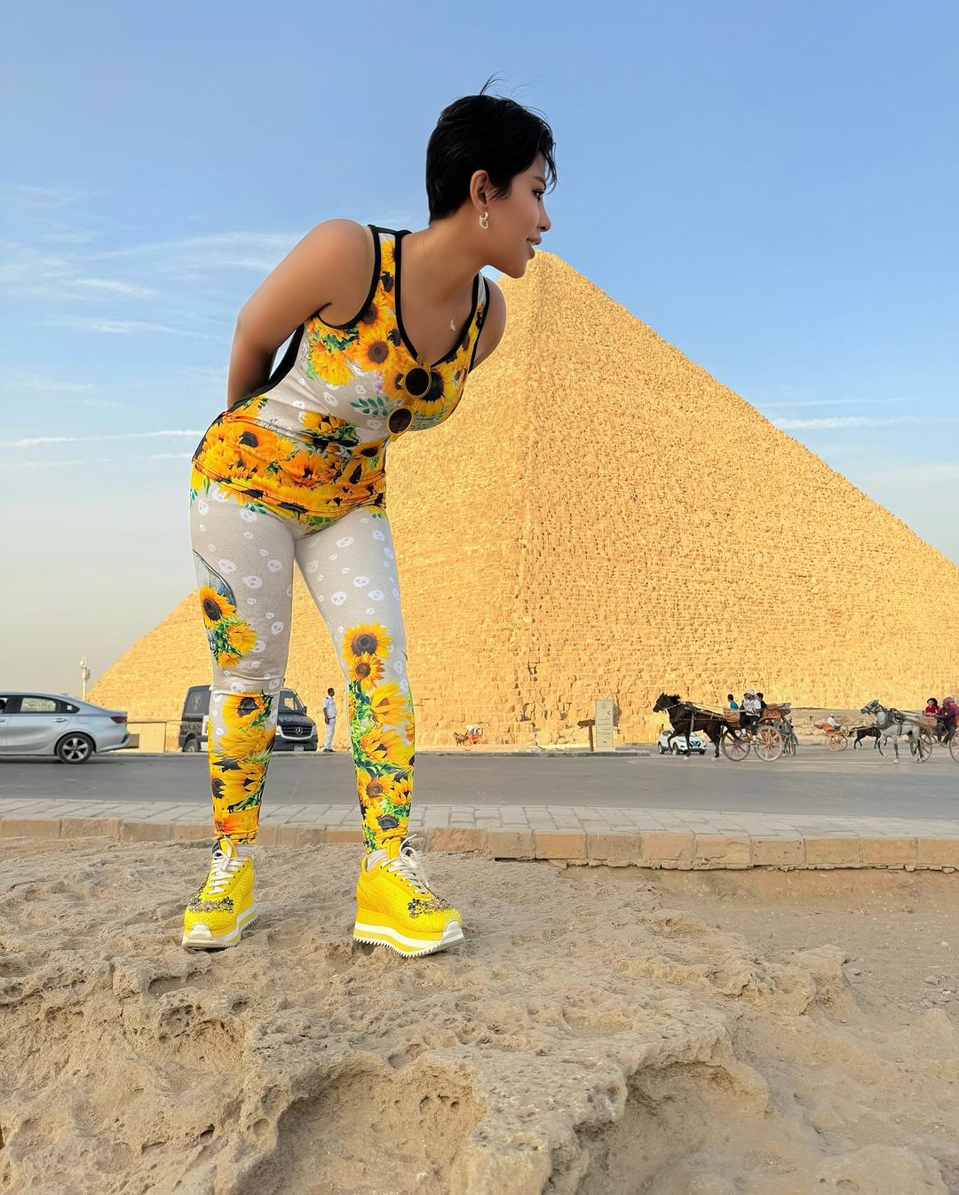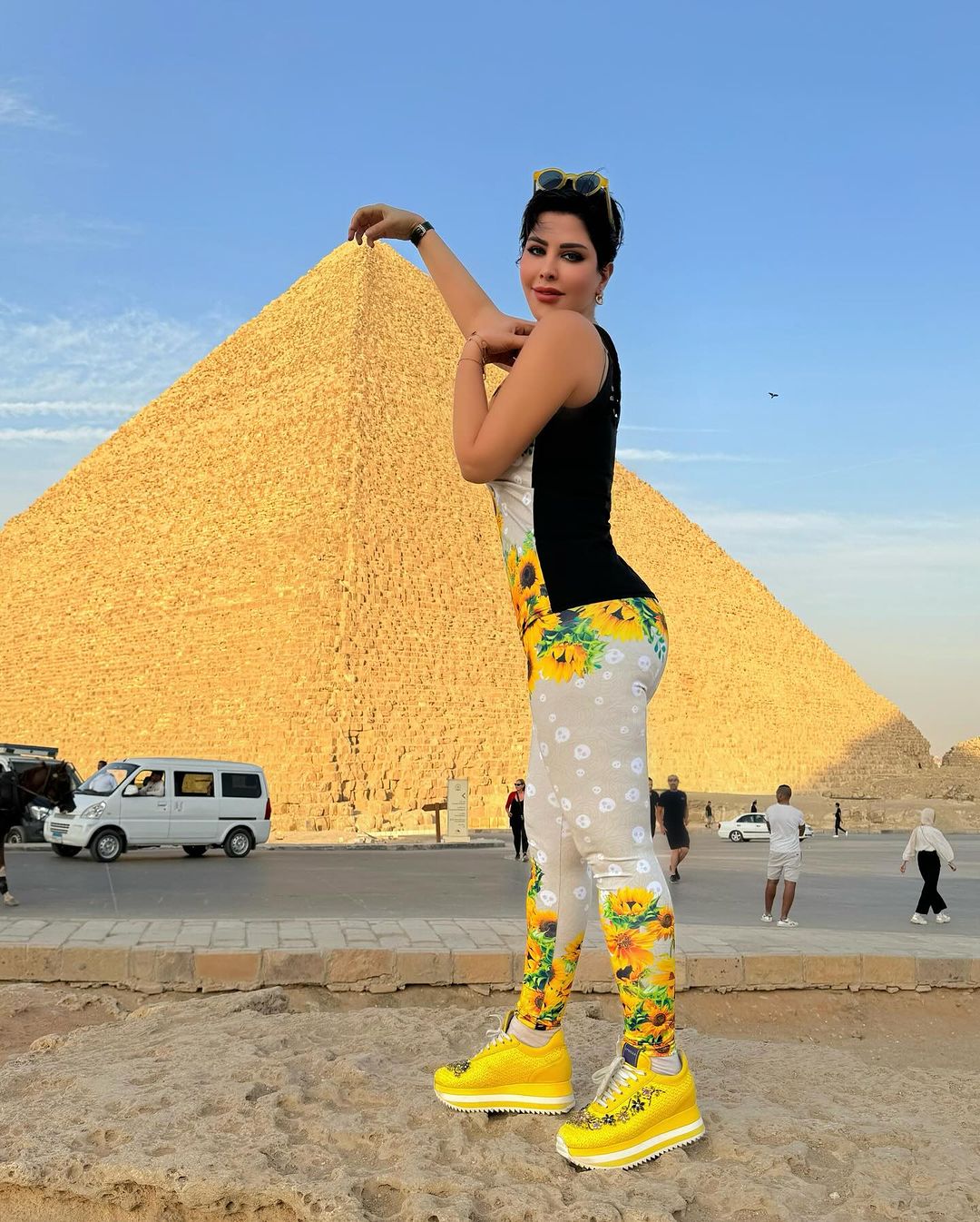 ظهرت فيه شمس الكويتيّة في الأهرامات، وكانت ترتدي بذلة قطنيّة رياضيّة مؤلّفة من ليغينغ مطبّع بزهرة دوّار الشمس الصفراء وبلوزة بالطابع نفسه، كما انتعلت حذاءً رياضياً عصرياً باللون الأصفر. إطلالة تنضح بالحيويّة!
