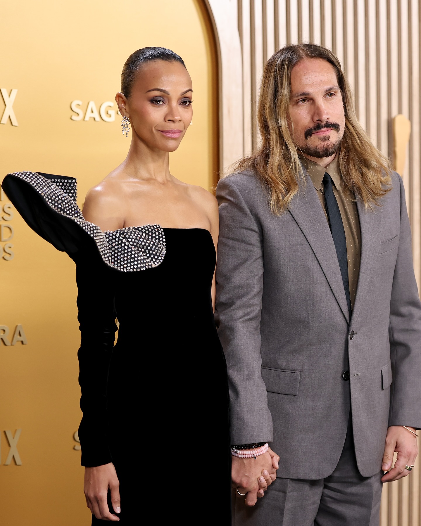 زوي سالدانا تأنّقت بفستان مخمليّ أسود يعانق الجسم، صمّم لها من "سان لوران" (Saint Laurent)، وهو مكشوف الكتفين وبكمّ واحد. تميّز الفستان بتفصيل منمّق بأحجار السواروفسكي البرّاقة ويشبه الوردة المفتوحة عند الكتف، والتي تمتدّ نحو أعلى الصدر. كذلك، تزينت بمجوهرات مرصّعة بالألماس من "كارتييه" (Cartier).