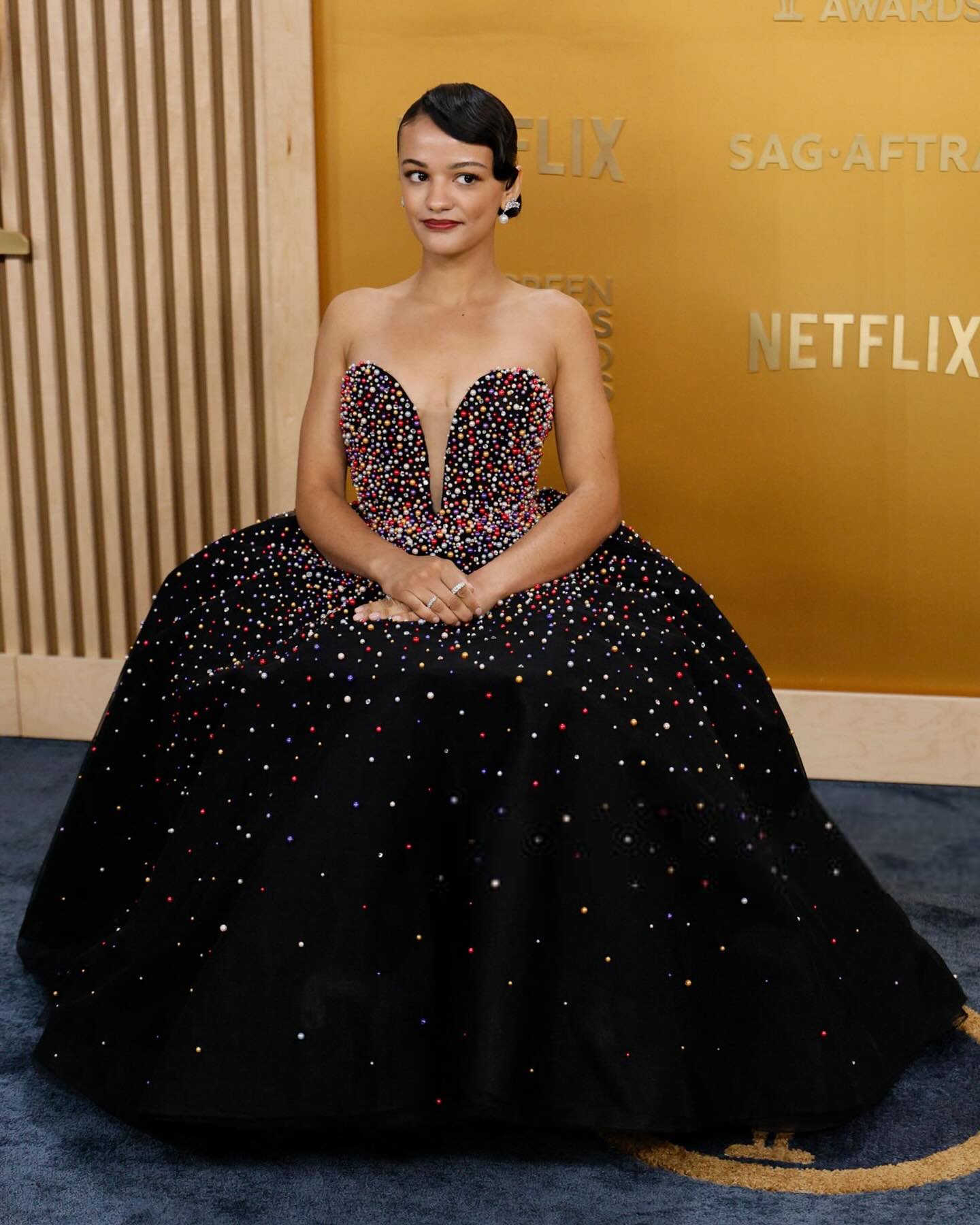 جيليان أندرسون بدت مميّزة بفستانٍ أسود منفوخ بدون حمّالات بتفصيل المربّعات، ومطبّع بأزهار بيضاء كبيرة من مجموعة الألبسة الجاهزة لخريف وشتاء 2025 من "كارولينا هيريرا" (Carolina Herrera).