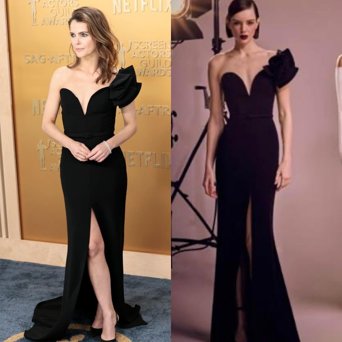 كيري راسل سارت على السّجّادة المخمليّة بفستان أسود طويل ذي كتف واحدة من مجموعة الألبسة الجاهزة لخريف وشتاء 2024 العائدة للمبدع اللبناني - العالمي زهير مراد. تميّز هذا الفستان بقصّة طويلة تعانق الجسم مع قطار متوسّط الطول، وتفصيل شقّ يكشف الساقين، وفتحة صدر عميقة. كذلك، تزيّنت النجمة الهوليووديّة بمجوهرات مرصّعة بالألماس من "بوشرير" (Bucherer).