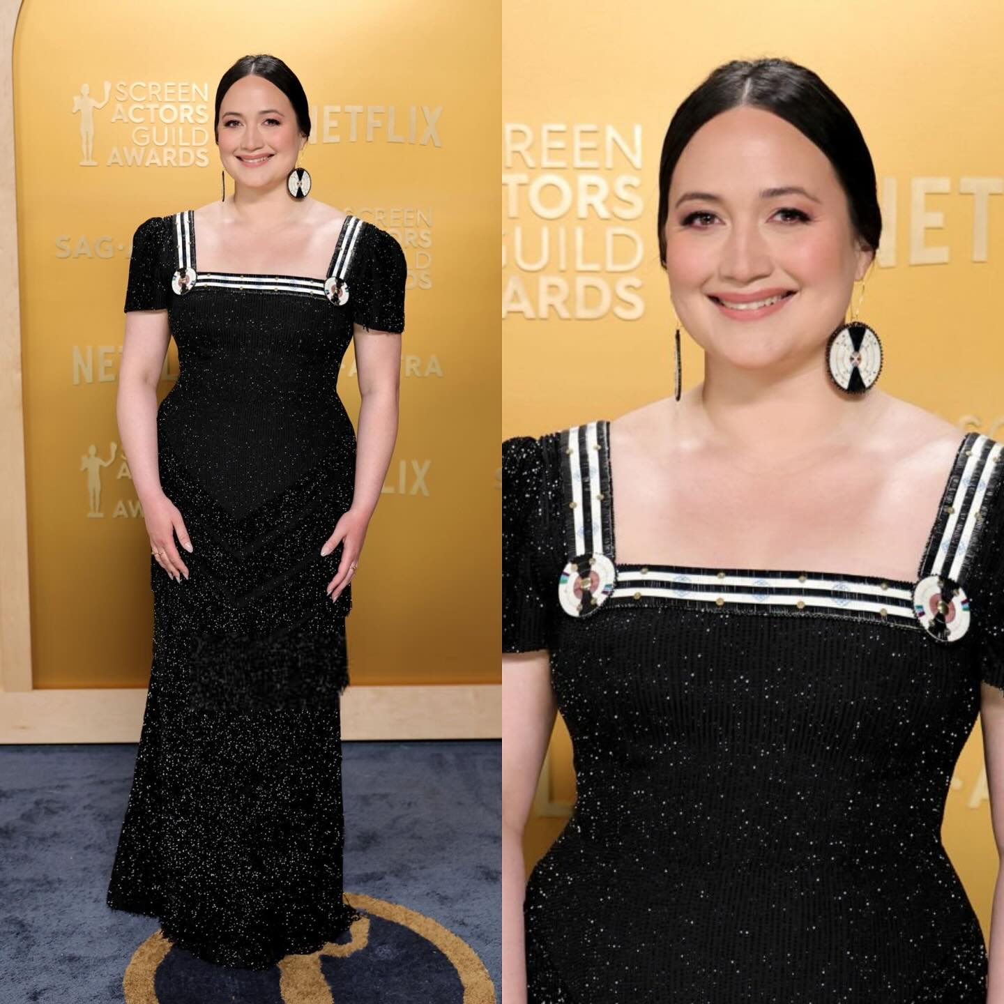 ليلي غلادستون تأنّقت بفستان أسود برّاق بتفصيل أبيض عند الصدر هو ثمرة تعاون بين دار "غوتشي" (Gucci) والفنّان "بيغ جو ماونتين" (Big Joe Mountain)، الذي صمّم قرطي الأذنين والأكسسوارات التي تزيّن الفستان بالنمط نفسه. وقد تميّز الفستان بقصّة طويلة تعانق الجسم مع كُمّين قصيرين. كذلك، انتعلت ليلي كندرة من علامة "جيانفيتو روسي" (Gianvito Rossi).