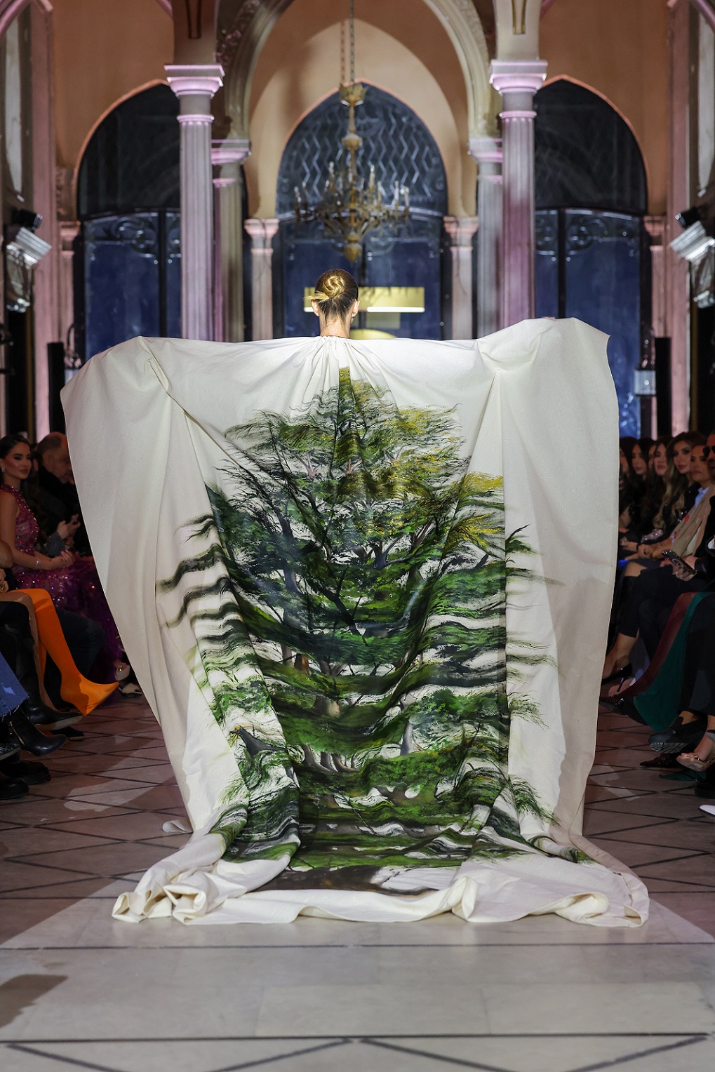 على وقع أغنية "لبيروت" التي أثارت مشاعر مؤثرّة في قلوب الحاضرين، انطلق العرض بإطلالة رائعة لإحدى العارضات بفستانٍ أبيض (لون السلام والأمل) كان بمثابة تحيّة خاصة للعاصمة اللبنانيّة، وهو مزيّن عند الصدر بأرزتين مطليتين بالذهب الأصفر، ومرصّع بأحجار "سواروفسكي"، كذلك تمّ إقرانه برداء كتفين مبهر بطول أربعة أمتار، رسمت عليه يدوياً أرزة خضراء كبيرة (رمز الشموخ والصمود) بالتعاون مع الرسامة المبدعة نجلا حبيش.