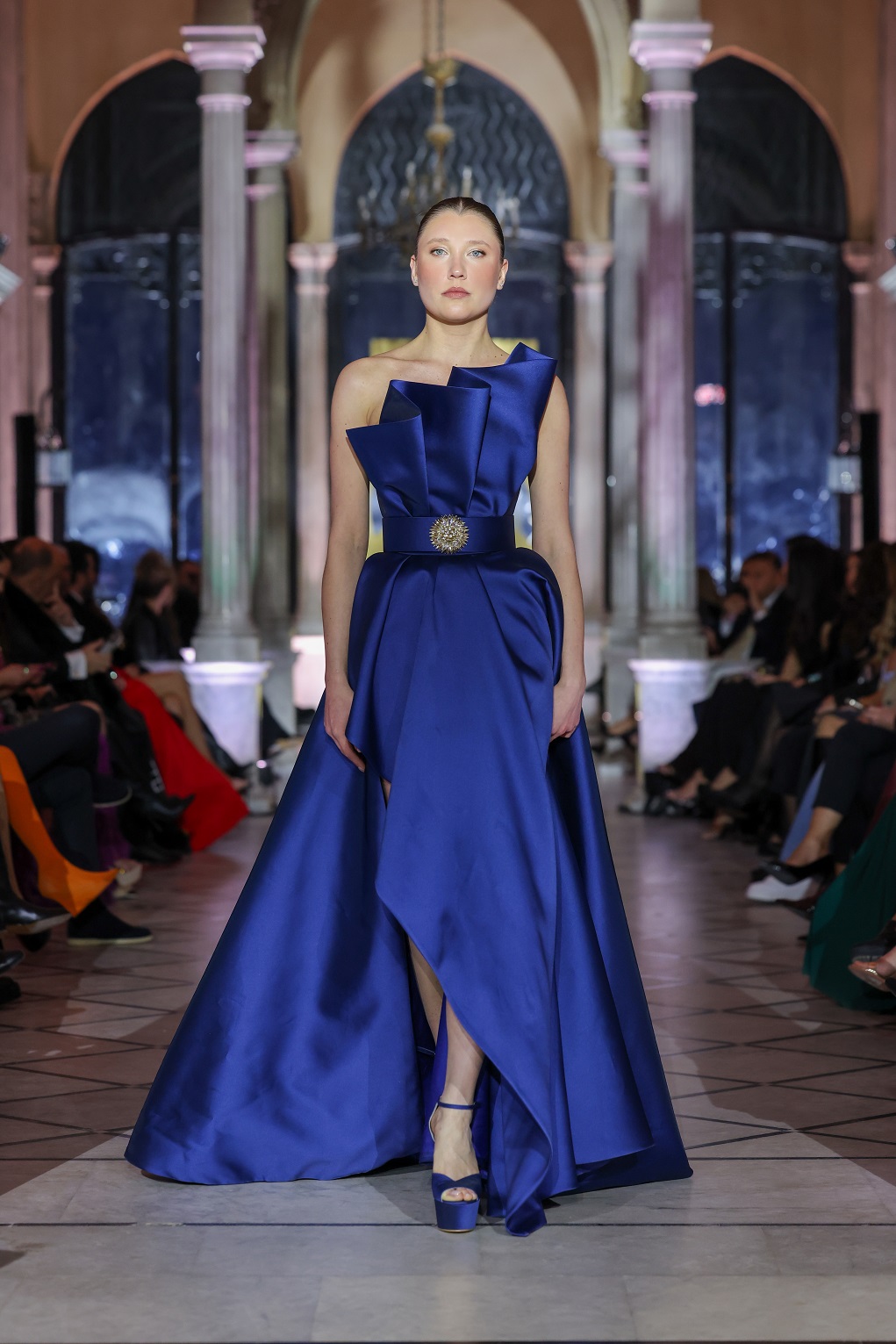 كذلك، تمّ اختيار الأقمشة بعناية لتنساب برقيّ وأنوثة، بحيث برزت خامات ساتان الحرير، الكريب، التافتا، ساتان (Duchesse)، التول، والموسلين، بينما اكتملت الإطلالات بإكسسوارات ذهبية مرصّعة بأحجار سواروفسكي ملوّنة، لتضيف لمسة من الرقي، الجاذبية، والرومانسية.