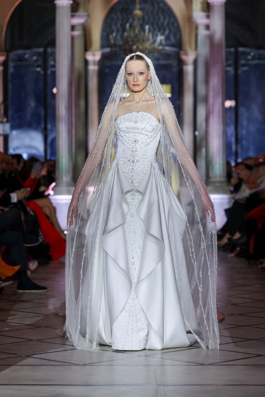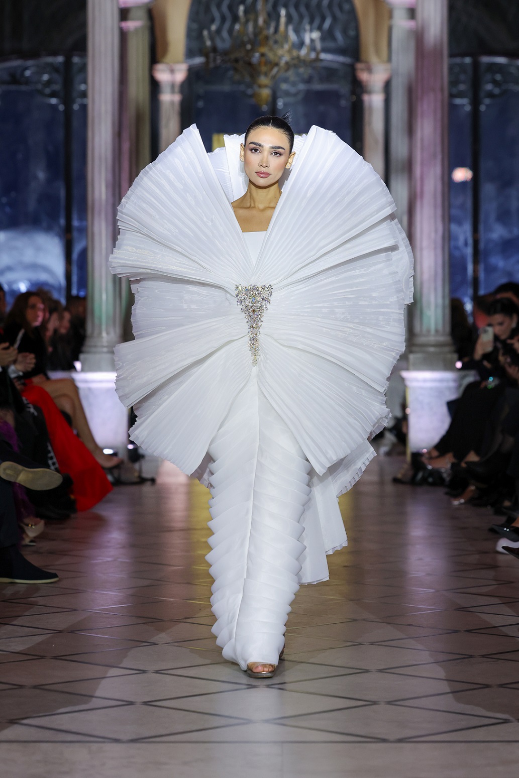 أسدل الستار على العرض بفساتين زفاف رائعة باللون الأبيض، جمعت بين الفخامة والرومانسية والابتكار، بتفاصيل أنثوية راقية، تمنح العروس إطلالة حالمة كالأميرات. وحمل أحدها عنصر المفاجأة بتفاصيله وفكرة تصميمه التي ذكرّتنا بالشمس وهالة خيوطها المشعّة.