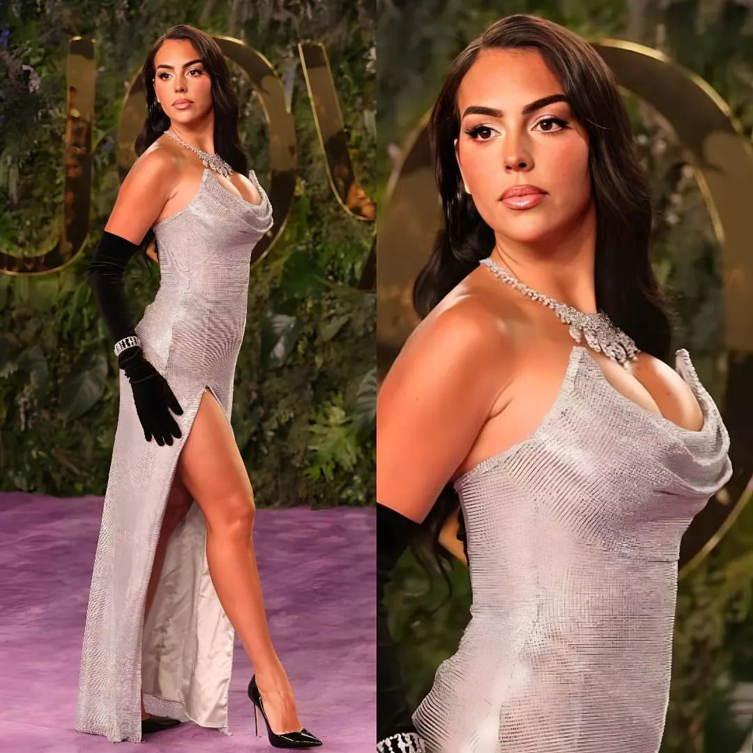 كانت جورجينا المثيرة والعاشقة للوكس، ترتدي ثوبَ سترابلس مثيراً أبرز ما فيه الحواف الدائري لأعلى الفستان والذي يكشف أكثر ممّا يخبئ، وطبعاً الثوب لاصق بالجسم يفصّل منحنياتها مع شق جانبي تظهر منه ساقها الرشيقة، وهو يجسّد ستايلها المعتاد، أقرنته جورجينا بحذاء stilettos أسود، وقفّازات أوبرا سوداء في يديها مع سوار على المعصم وعقد كبير من الماس يزيّن عنقها.