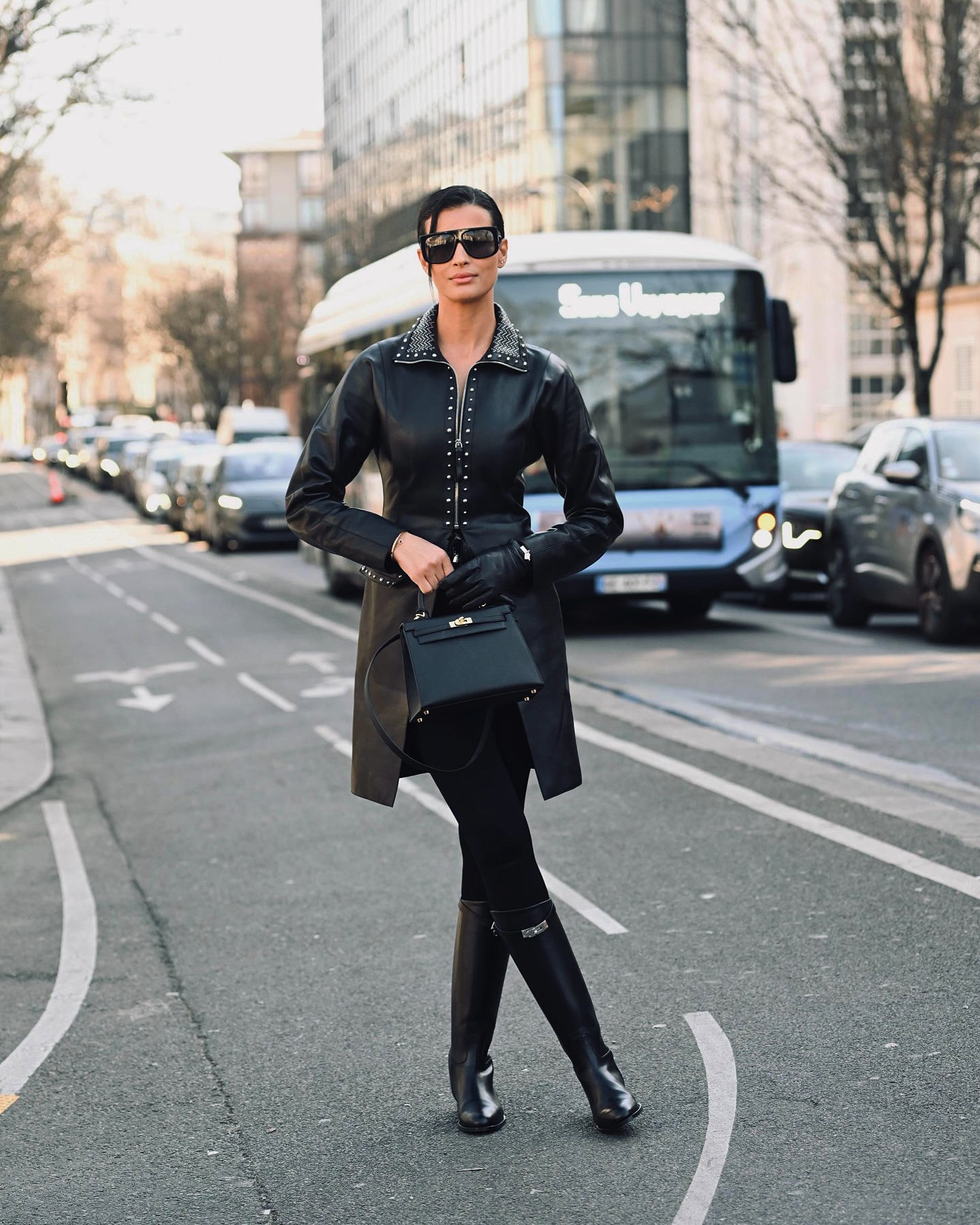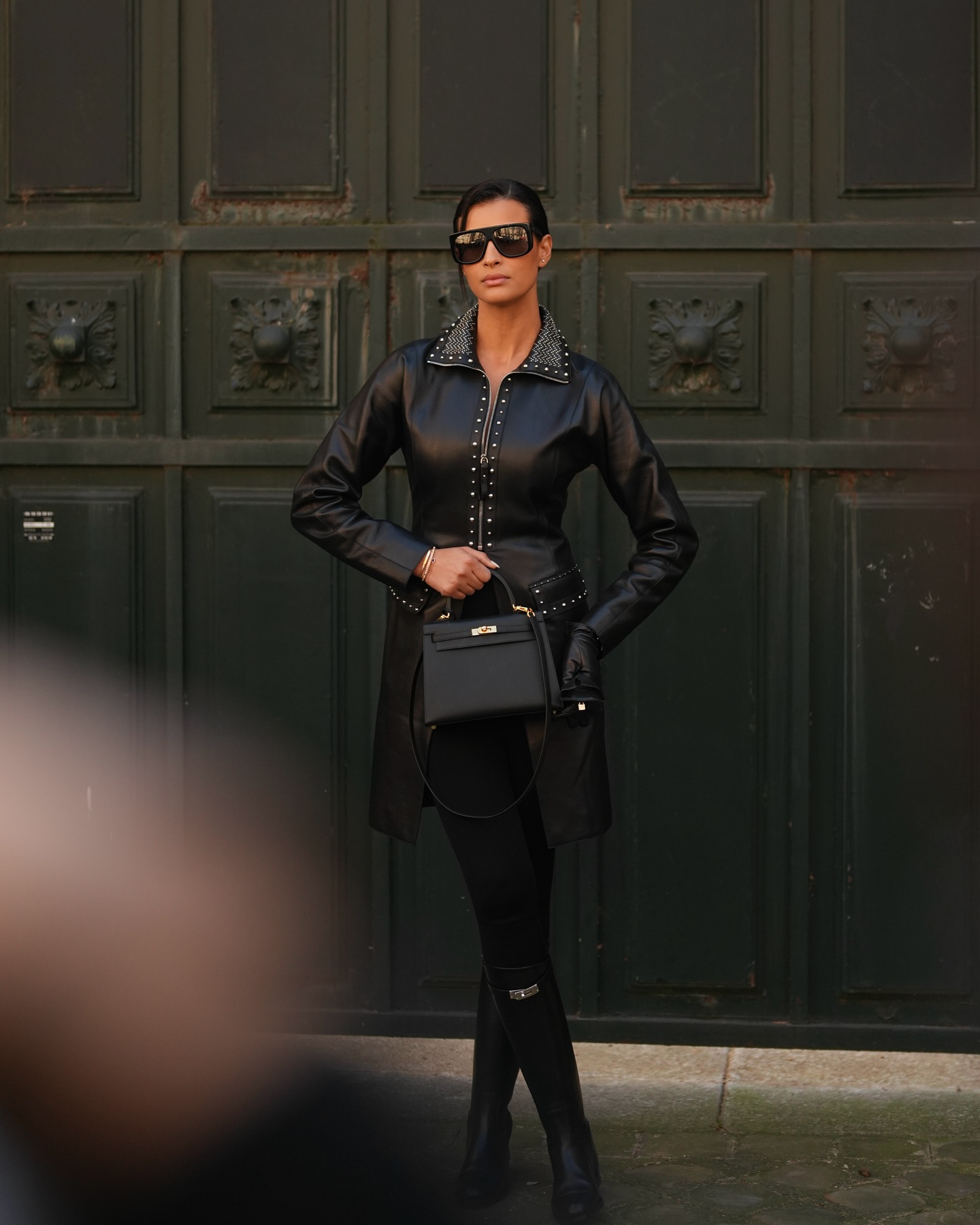 في عرض "هيرمس" (Hermes)، اختارت ريم التأنّق بإطلالة كاملة من العلامة الفرنسيّة الراقية، فارتدت سروالاً ضيّقاً من نوع "Leggings" مع سترة طويلة من الجلد مزيّنة بمسامير فضّيّة، وحملت حقيبة "Kelly 28"، نسّقتها مع جزمة طويلة وقفّازين من الجلد، ونظّارة شمسيّة كبيرة.
