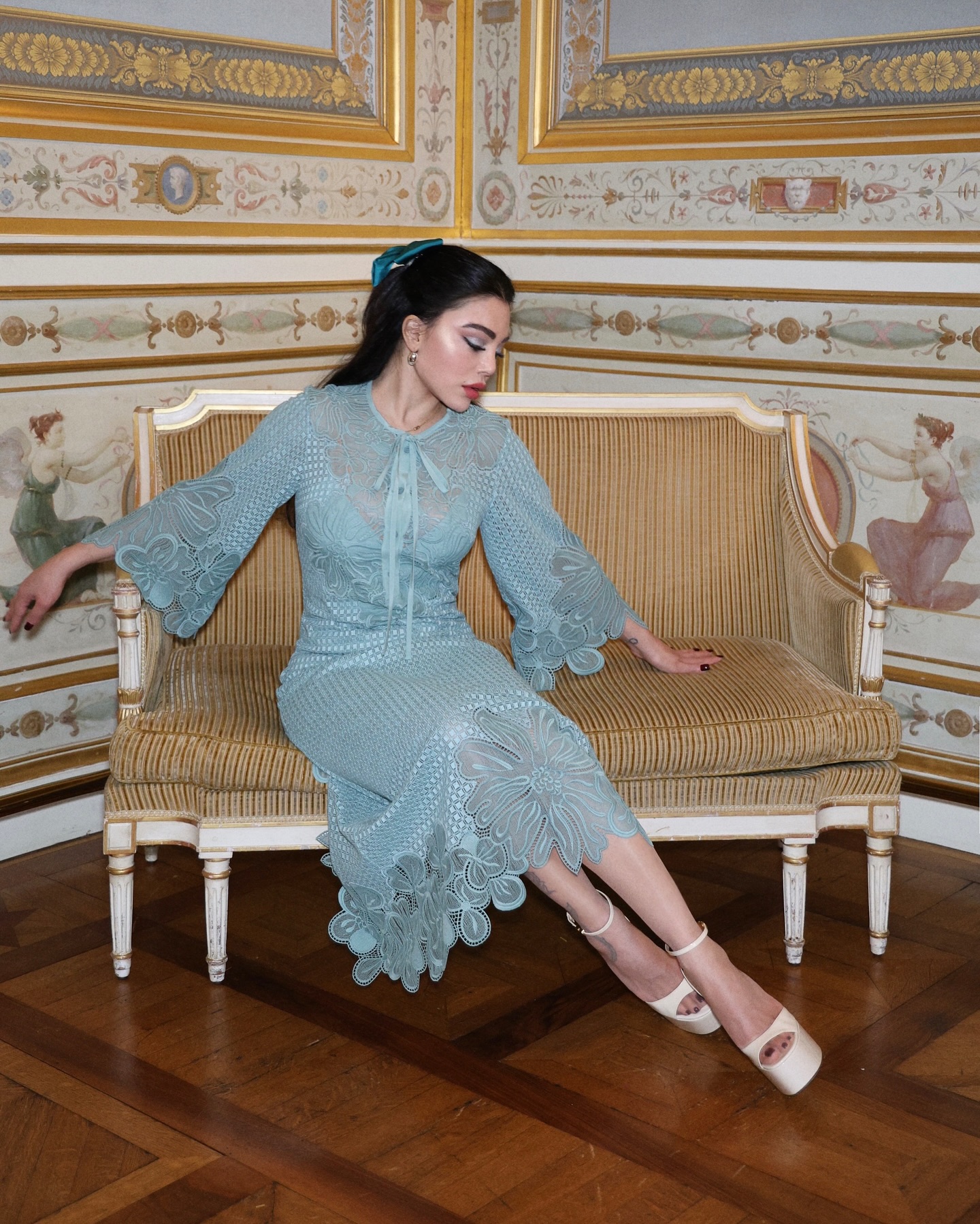 فستان هيفاء وهبي الذي جاء بنمط القفطان المعتدل باللون الأخضر الثلجي مع كُمّين قصيرين يتسعان تدريجياً نحو الأطراف Macrame Midi Kaftan in Iceberg Green بقيمة 2,900$. تمّ تنفيذ تخريمات الأزهار فيه بتقنيّة "المكرميّة" أي فن الحياكة والعقد اليدويّة من خلال تشكيل الخيوط وربطها بطرق مختلفة للحصول على زخارف فريدة بأنماطها من دون استعمال الإبرة أو الاعتماد على الحياكة التقليديّة. وقد نسّقت الديفا اللبنانيّة إطلالتها مع قرطي أذنين من الذهب الأبيض، كما انتعلت صندلاً من الجلد الأبيض بمنصّة ضخمة وكعبٍ شاهقٍ عريض. كذلك، وضعت نظّارة شمسيّة سوداء من علامة "غوتشي" (Gucci).