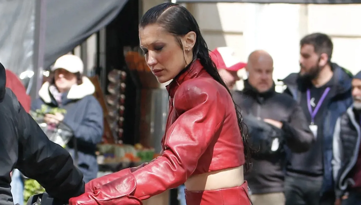 بيلا حديد بموضة الجلد الأحمر في شوارع باريس (صور وفيديو)