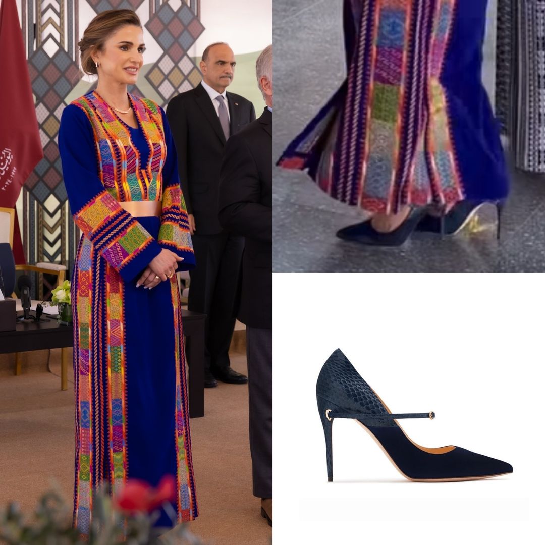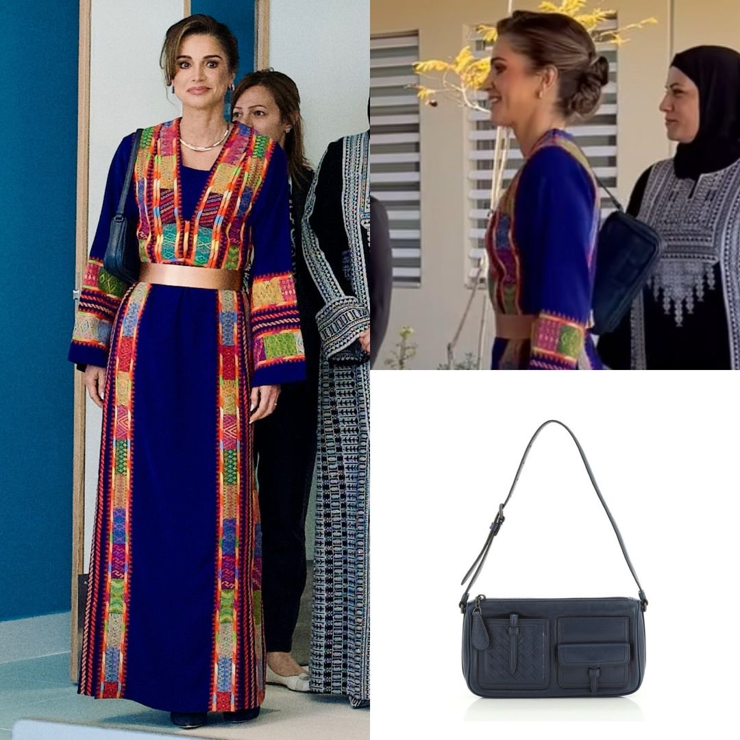 ولاستكمال إطلالتها حملت الملكة جزداناً صغيراً بجيب مزدوج من Bottega Veneta وانتعلت حذاءً من توقيع Jennifer Chamandi وزيّنت عنقها بشوكر رفيع من الذهب الأصفر.