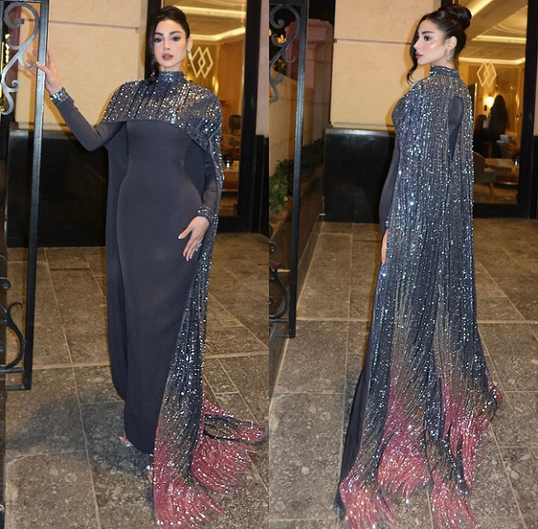 أمّا مؤثرّة الموضة البحرينيّة زينب العلوان فاختارت قفطاناً أنيقاً جداً بلون دخاني مقروناً برداء كتفيْن يلامس الأرض، وهو مطرّز بالكامل بالترتر البرّاق بلوني الفضّي والبرغندي، كما تزيّنت بمجوهرات ماسيّة، وانتعلت صندلاً مفتوحاً فضّي اللون منمّقاً بالكريستال.