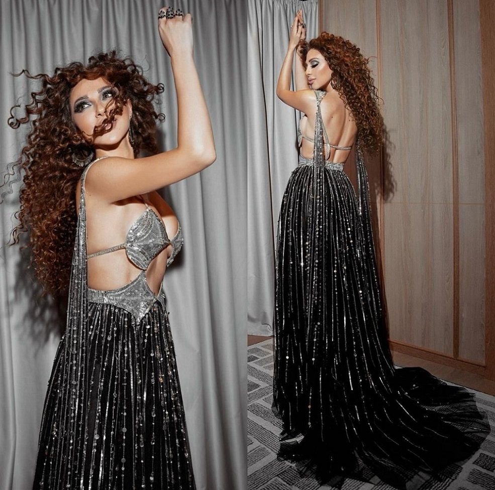 تميّز الفستان الذي ارتدته ملكة المسرح بقصّة طويلة منسدلة بدون كُمّيْن، وهو مكشوف الصدر والظهر ومن الجانبيْن، حيث أنّ القسم العلوي منه بتوليفة قطع هندسيّة الشكل مطعّمة بالترتر الفضّي، وينسدل منها وشاحان طويلان على طول الفستان من الخلف من الشيفون الأسود المطرّز بحبالٍ من الخرز والترتر من أنواع وأحجام مختلفة يحاكي نمط التنّورة. كما تزيّنت ميريام بمجوهرات مرصّعة بالماس من سيلفي صليبا.