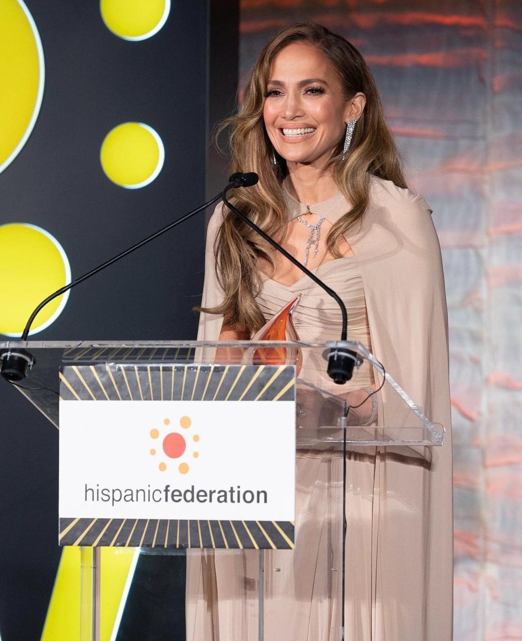 بدت جينيفر لوبيز فاتنة بأناقتها المميّزة من مونيك لولييه Monique Lhuillier، وهي تتسلّم جائزة الفخر Premio Orgullo التكريمية في حفل الاتحاد الإسباني Hispanic Federation لكونها نجمة عالمية أيقونية، متعددة المواهب، صاحبة رؤية، ومحبة للغير.