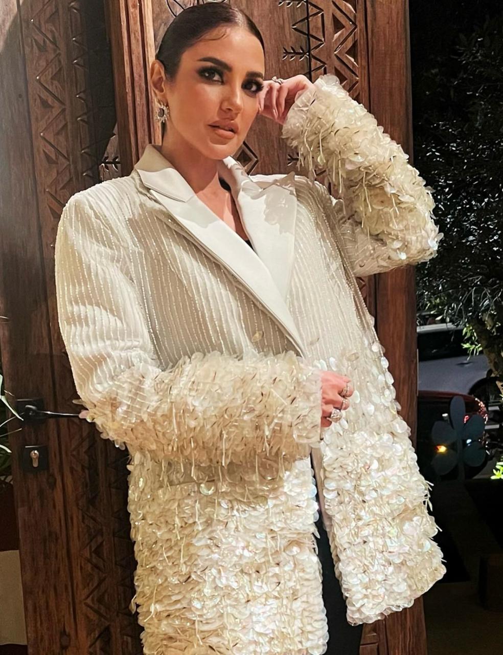وفي إطلالة مختلفة، ارتدت درّة سروالاً أسود مع "توب" من اللون نفسه، نسقتهما مع سترة مميزة من المصمم اللبناني-العالمي رامي قاضي، وهي بقصّة كلاسيكية واسعة بلون البيج ومطرزة بالكامل بالخرز والترتر من أحجام كبيرة.