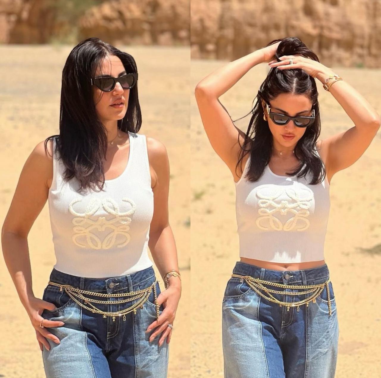 وفي إطلالة مختلفة، ارتدت درّة سروالاً من الدنيم بلونيْ الأزرق الفاتح والداكن بقصّة مريحة مع "توب" بيضاء بدون كُمّيْن من Loewe، وحدّدت سروالها بحزام من السلاسل الفضّيّة.