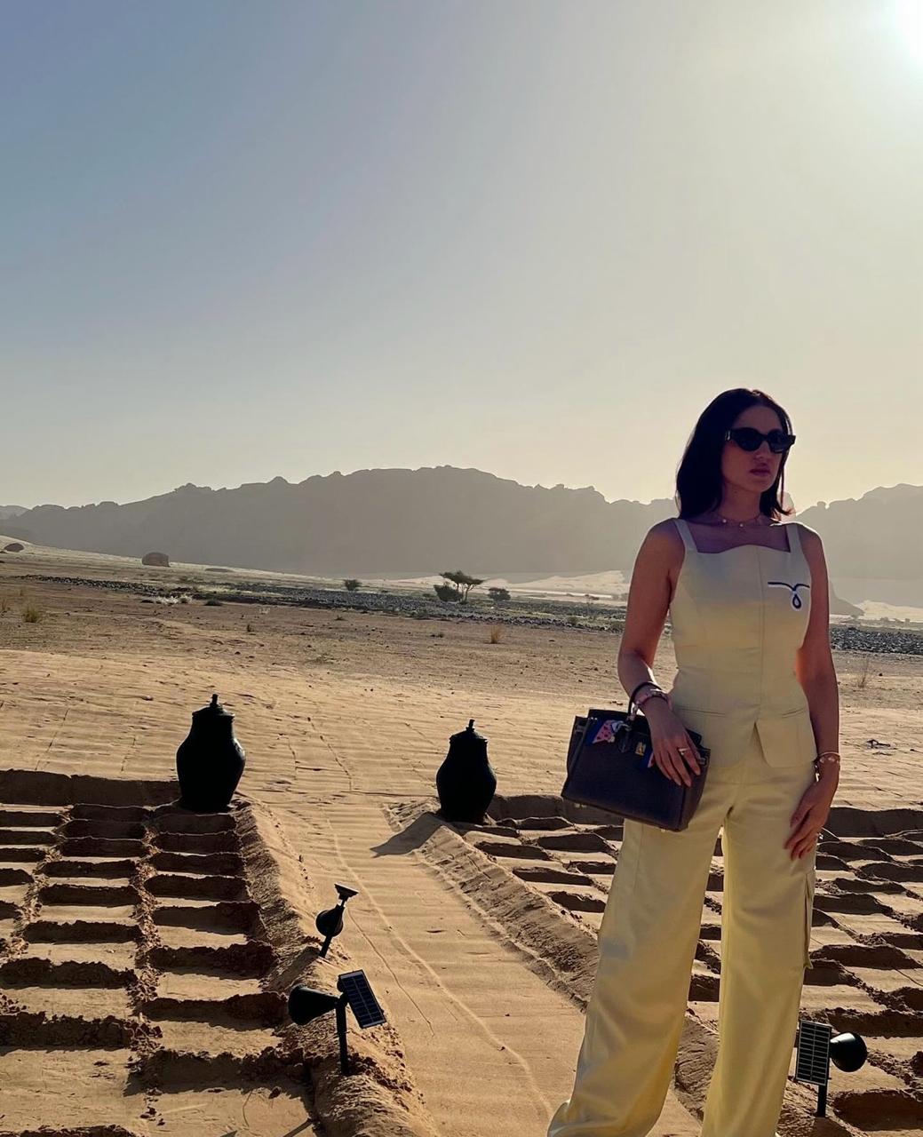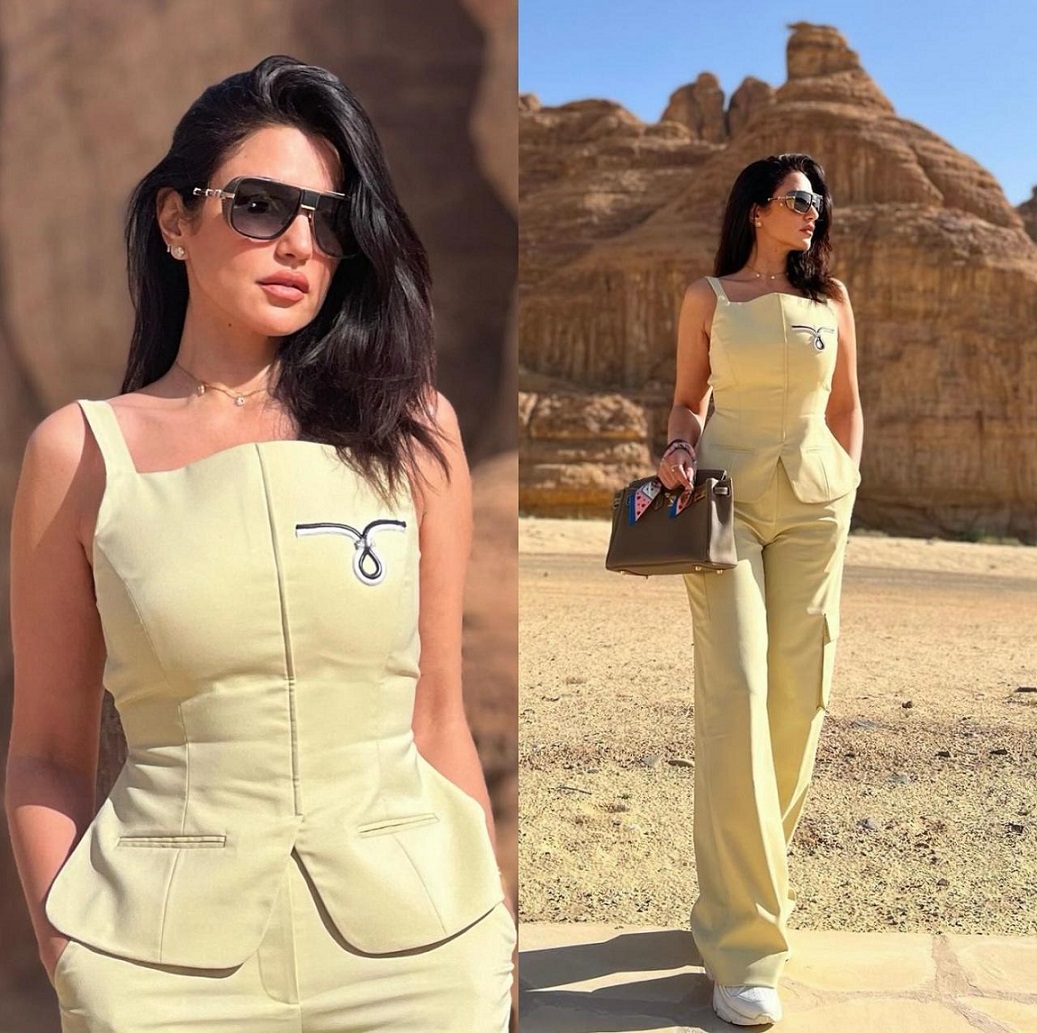 وأثناء استكشافها مدينة العلا، نشرت درّة إطلالتيْن "كاجوال" لها من تنسيق خبير المظهر محمد أشرف، الأولى بسروال مريح و"توب" بدون كُمّيْن كلاهما باللون الأخضر الفستقي الفاتح من Nafsika Skourti، نسقتهما مع نظّارات شمسية داكنة من Balmain، وحذاء رياضي أبيض، وحقيبة من الجلد بلون البيج-الرمادي من Hermes.