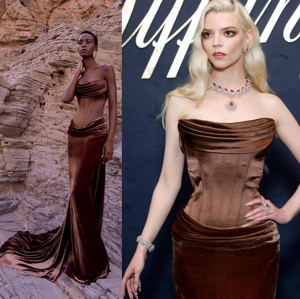 واختار خبير المظهر ريان هاستينغز فستان آنيا باللون البنّي من مجموعة الخياطة الراقية Earthly لربيع وصيف 2024، وهو مميّز بقصّة طويلة بدون حمّالات، بنمط "كورسيه" من ساتان الحرير بتفصيل الثنيات مع تنّورة مخمليّة طويلة تعانق الجسم وبتفصيل ذيلٍ طويل Look 2- Velvet Canyon ، كما تزيّنت بمجوهرات مذهلة من Tiffany & Co مرصّعة بالماس وأحجار كبيرة من الياقوت الأحمر. كذلك، انتعلت آنيا صندلاً فضّي اللون.