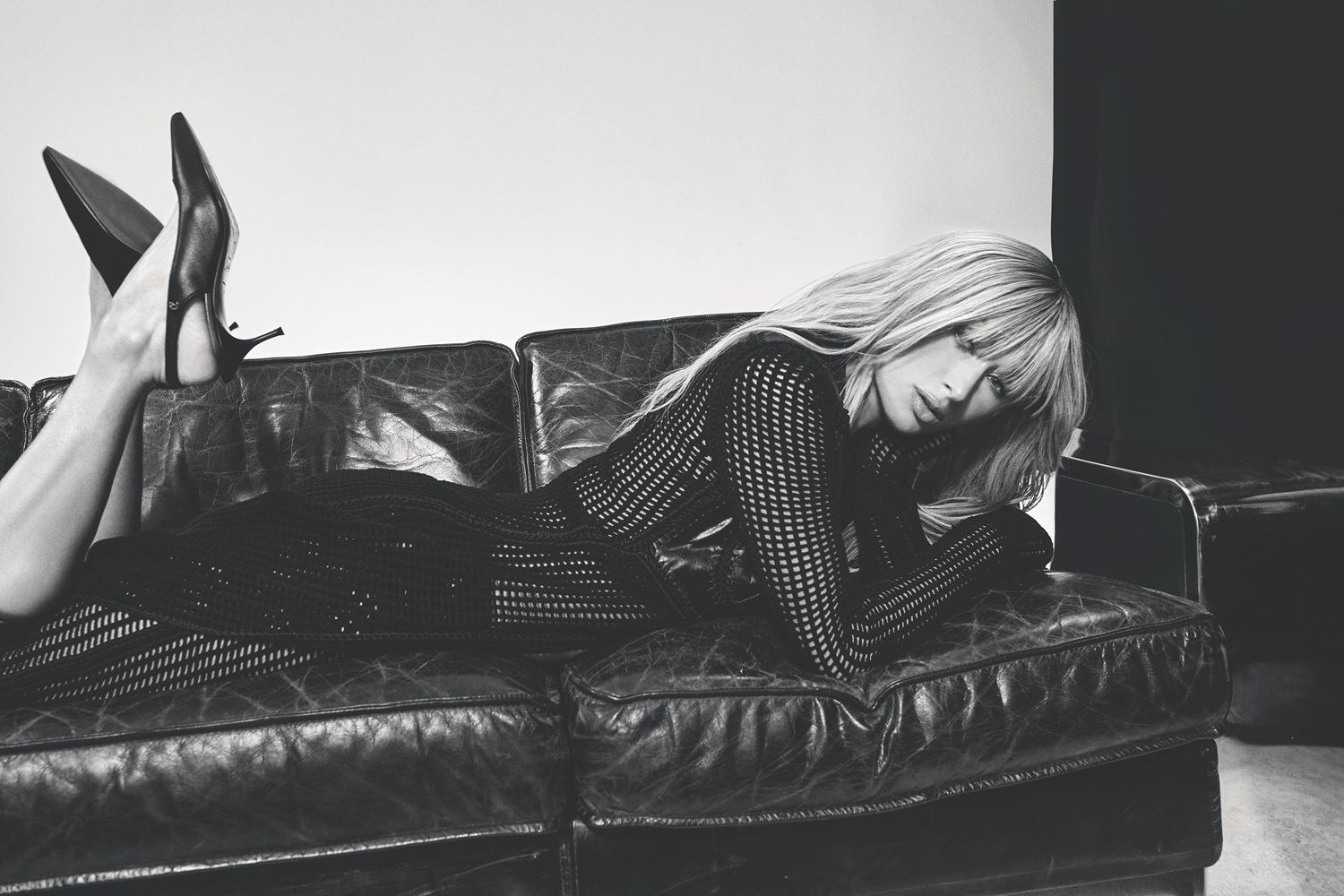 وفي صورة ثانية، أطلّت بالملابس الداخلية السوداء بالكامل من Versace، مع جوارب طويلة وحذاء بمقدمة مدببة.