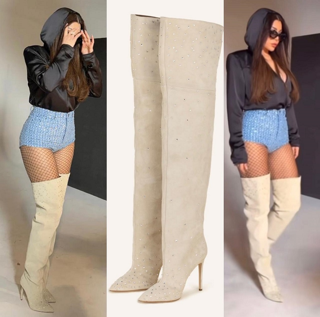 وفي الإطلالة الثانية، بدت هيفاء فاتنة بفستانٍ قصير جداً ينحت جسمها مع كُمّيْن طويليْن وقبّة عالية باللون الوردي النابض، أقرنته مع قرطيْ أذنيْن طويليْن مرصّعيْن بالكريستال، وانتعلت جزمة طويلة بكعبٍ عالٍ بلون فستانها من خليل الزين.