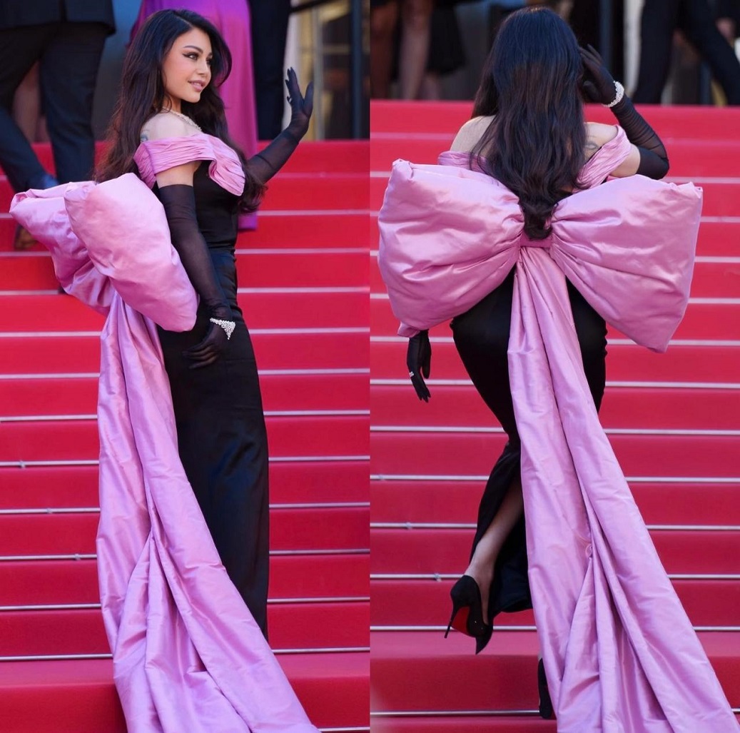 وقد تبخترت هيفاء على السجادة الحمراء بفستان من ساتان الحرير الأسود من Bolandy Moda، بقصّة طويلة تعانق الجسم ومُحدّدة الخصر، وشق من الخلف يسهّل المشي، وتفصيل وردي اللون مزموم يغطّي الصدر والكتفيْن وينسدل من الخلف ليشكّل عقدة ضخمة تشكّل نهاياتها ذيل الفستان. كذلك، تزيّنت هيفاء بمجوهرات ملفتة من البلاتين المرصّع بالماس من مجموعة Mimosa من Damiani، ووضعت قفّازي "أوبرا" شفّافيْن باللون الأسود، وانتعلت كندرة سوداء مدبّبة بكعبٍ عالٍ من Louboutin.