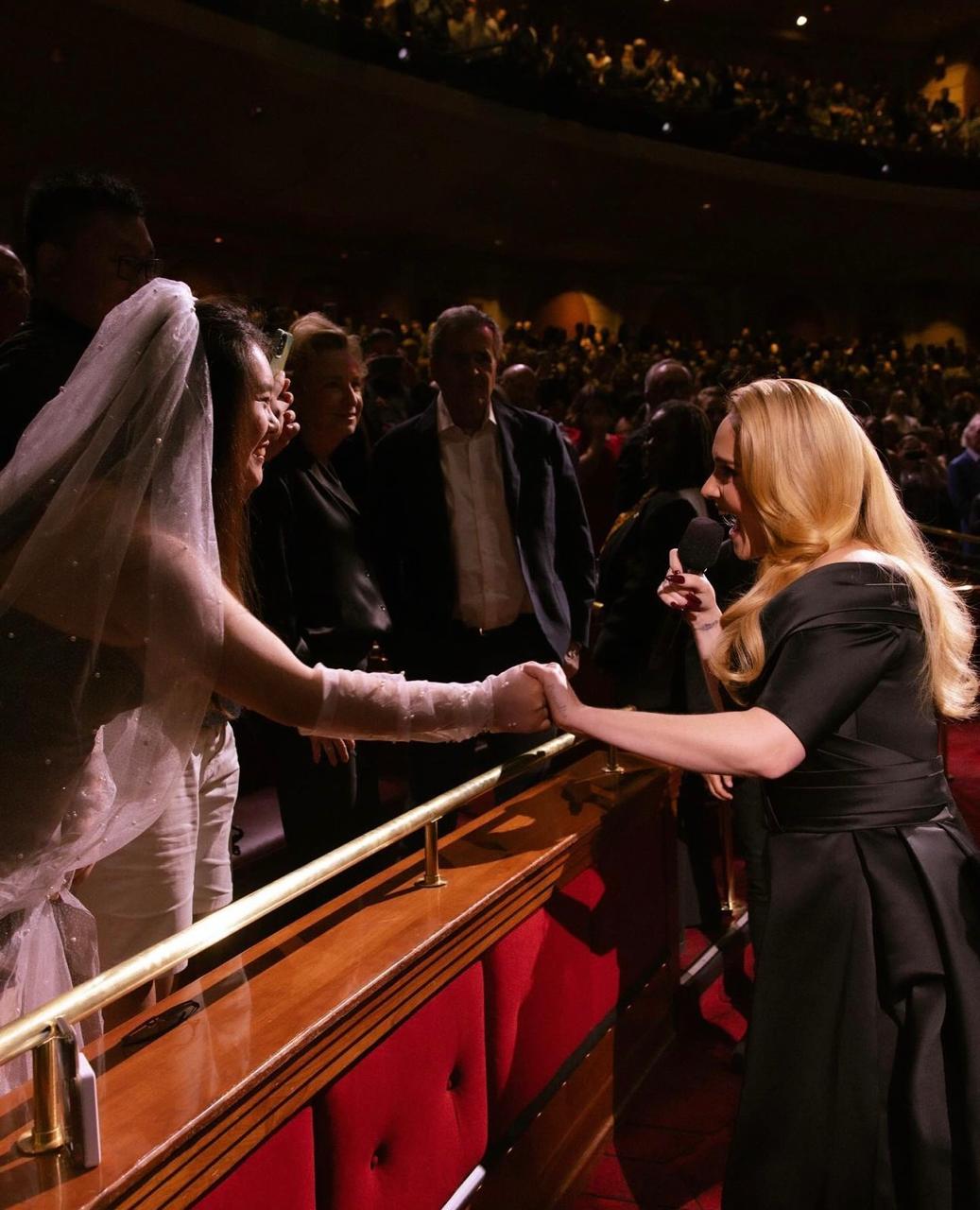 وقد أطلّت أديل على جمهورها في أحدث حفل غنائي لها في لاس فيغاس، بفستانٍ من مجموعة الخياطة الراقية بتوليفة من ساتان الحرير الأسود من اللبناني-العالمي إيلي صعب، صُمّم بحسب طلبها، وهو مميّز بقصّة طويلة مكشوفة الصدر والكتفيْن، وبتفاصيل الثنيات المتداخلة عند الجزء العلوي من الفستان مع خصر محدّد، في حين جاءت التنّورة منسدلة مع ذيل طول من الخلف. واكتفت أديل بتزيين أذنيْها بقرطيْن كبيريْن.