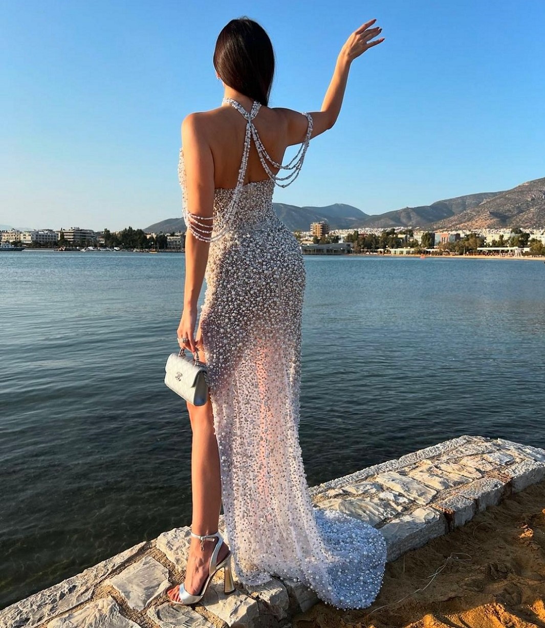 وفي إطلالة أنيقة ومغرية، تألّقت جيسي بفستان فضّي طويل منمّق بحبّات اللؤلؤ، ينحت جسمها من الأعلى وينساب ملامساً الأرض مع شق يكشف ساقها اليسرى، وهو مميّز بسلاسل من اللآلىء تلّتف حول العنق وتنسدل على الظهر والذراعيْن، اختارته من مجموعة الخياطة الراقية للصيف من المصمّم اللبناني رامي سلمون، كما انتعلت صندلاً فضّي اللون بكعبٍ عالٍ After Party Metallic Open Toe Heel بقيمة 134 يورو من Steve Madden، وحملت حقيبة فاخرة من Chanel، كما تزيّنت بمجوهرات من البلاتين المرصّع بالماس.