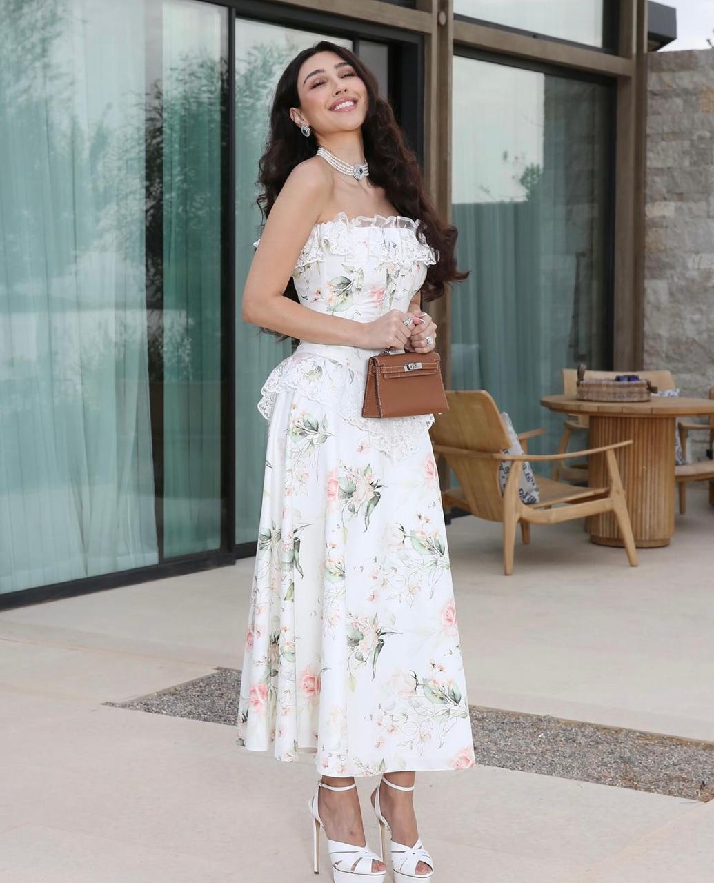 أمّا إطلالة جيسي الثالثة، فجاءت بتصميمٍ منعش أبيض اللون ومطبّع بالأزهار الورديّة الزاهيّة وأوراقها الخضراء من مجموعة الألبسة الجاهزة للصيف من علامة The HHart، شمل تنورة طويلة وواسعة، و"كورسيه" بدون كُمّيْن مزيّنة بالدانتيل، كما حملت حقيبة يد صغيرة بلون الكاراميلGold Epsom Mini Kelly بقيمة 35,800$ من Hermes، وانتعلت صندلاً مفتوحاً بمنصّة ضخمة من الجلد الأبيض، وتزيّنت بإكسسوارات من اللآلىء البيضاء، وخواتم ماسيّة من Bulgari.