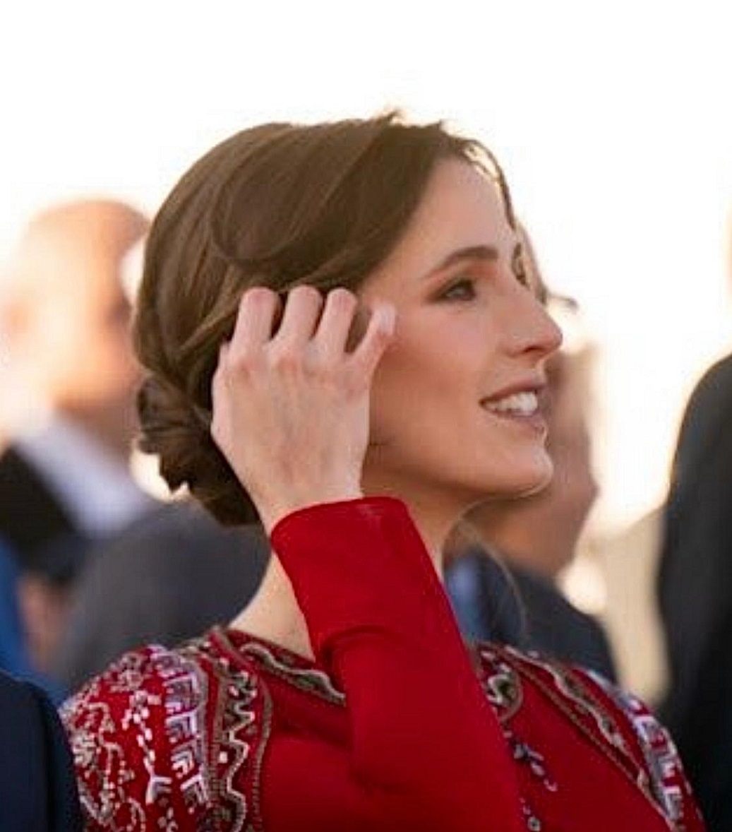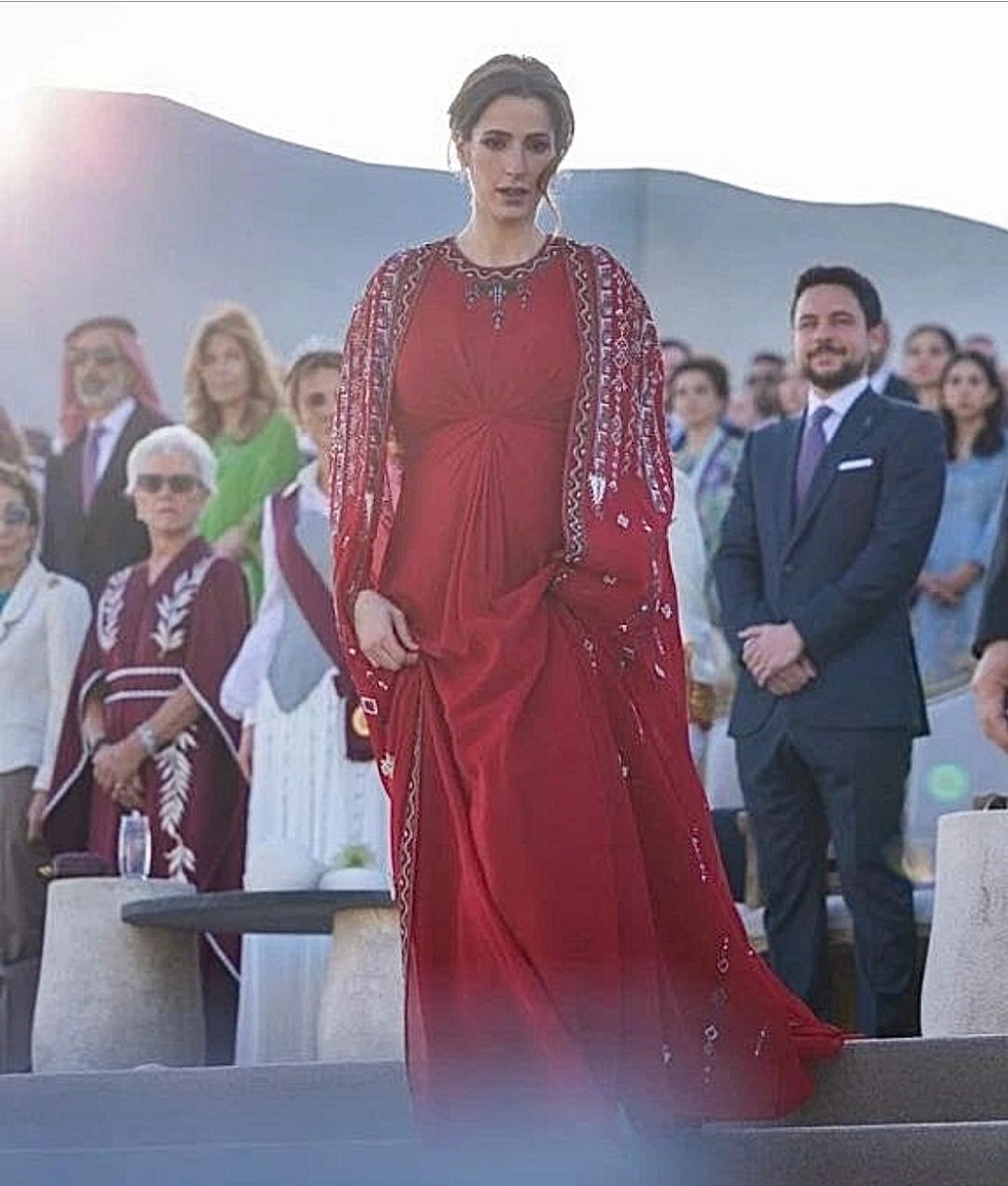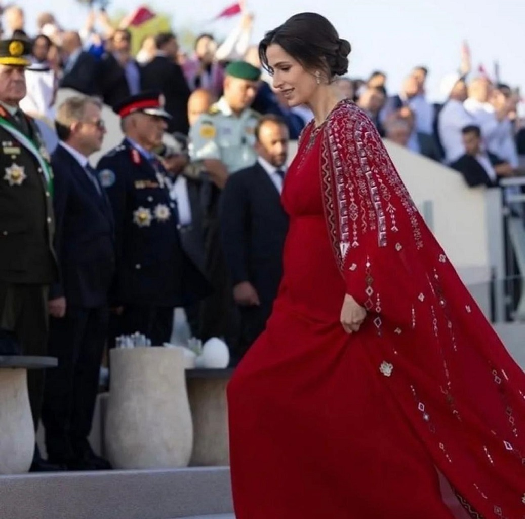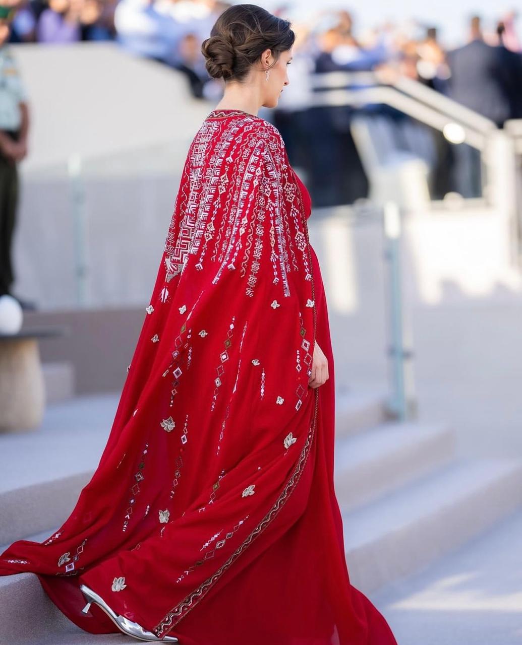 أسرت الأميرة رجوة الحسين القلوب بإطلالتها الراقية باللون الأحمر إلى جانب ولي العهد سمو الأمير الحسين بن عبدالله الثاني، في الفعالية الوطنية لمناسبة اليوبيل الفضي لتولّي جلالة الملك عبدالله الثاني سلطاته الدستوريّة، وتميّز قفطانها بتطريزات بألوان العلم الأردني.
