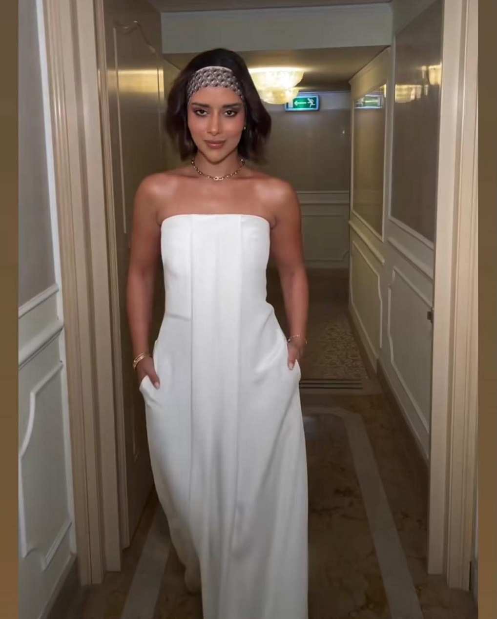 في الإطلالة الثانية، بدت بلقيس فاتنة باللون الأبيض الذي يلائم بشرتها السمراء بامتياز، حيث ارتدت "جمبسوت" أبيض اللون بقصّة مبتكرة بدون حمّالات Strapless، وتفصيل نسيجٍ ينسدل على طول الجسم مُغلّفاً السروال الواسع السّاقيْن. كذلك، اعتمدت بلقيس تسريحة الشعر الملساء والمرفوعة عن الوجه بعُصابة مطبّعة بأشكال هندسيّة ملوّنة، وجاء مكياجها بألوان ترابيّة دافئة.