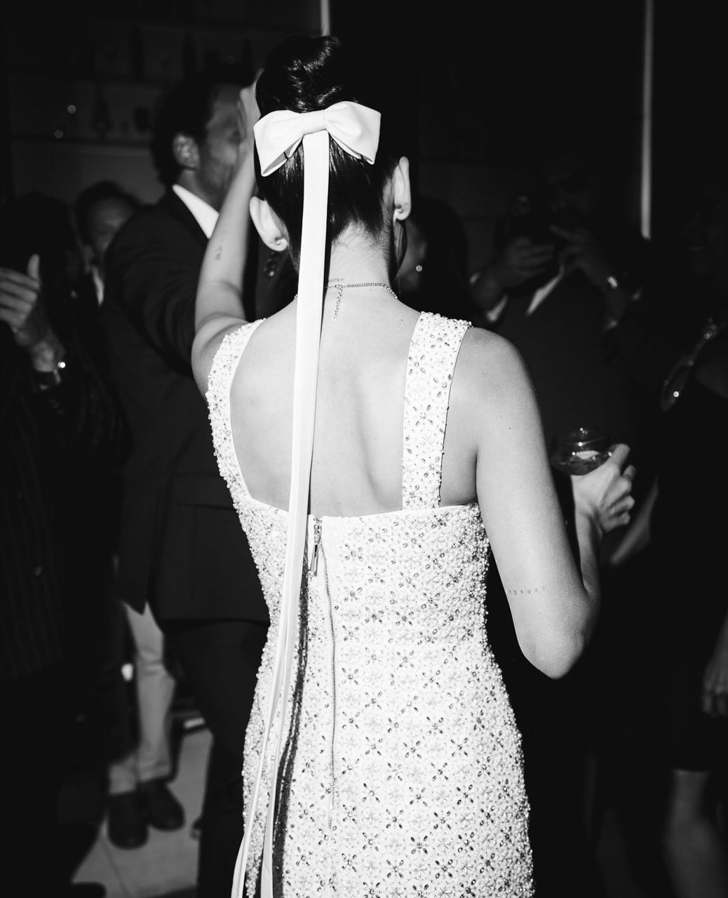 وخلال سهرة الزفاف، بدّلت سلمى أبو ضيف فستانها، وارتدت ثوباً قصيراً بقصّة ضيّقة وبدون كُمّيْن من مجموعة فساتين الزفاف للمصمّمة اليونانيّة-الأردنيّة Nafsika Skourti، وهو مزيّن بعقدتيْن من جانبيْ الصدر، ومطرّز يدوياً بالكريستال البرّاق. وفي هذه الإطلالة زيّنت سلمى تسريحة شعرها بإكسسوارٍ على شكل عقدة كبيرة، كما انتعلت كندرة بيضاء بمنصّة ضخمة مزيّنة بالكريستال من Valentino.