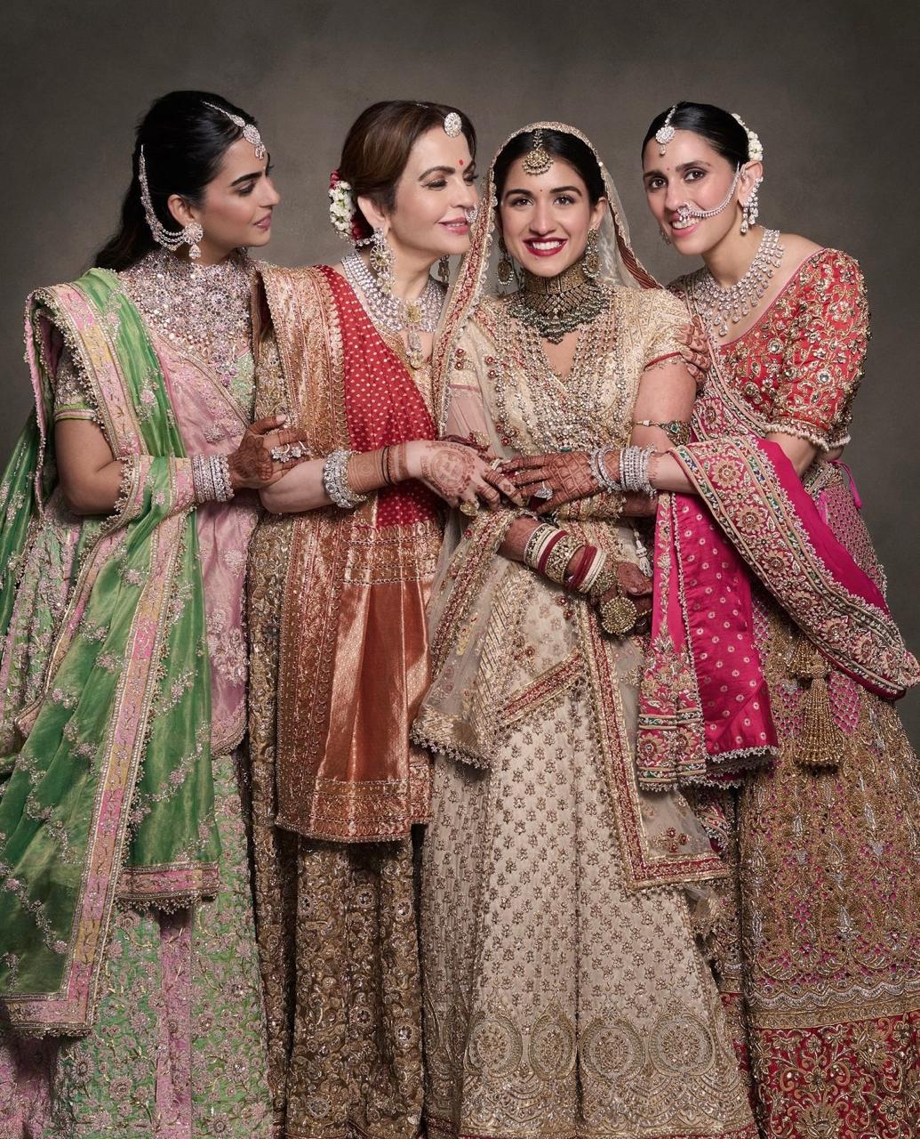في حفل "شوبه آشيرواد"، ارتدت سيّدة الأعمال والمحسنة نيتا أمباني زيّاً صُمّم خصيصاً لها من المصمّميْن أبو جاني وسانديب خوسلا Abu Jani and Sandeep Khosla يكرّم العائلة ورموز الحب والعطاء من خلال عمل حرفي متقن، شمل غاغرا (تنّورة طويلة) بنمط "زردوزي" (تطريز ذهبي) مستوحى من معابد "كاشي" وهندسته المعماريّة. وقد تمّ تنميق التطريز اليدوي بالجواهر على شكل زخارف "جومكا" (أجراس صغيرة)، إضافة إلى رسم للفيلة الميمونة  يزيّن القماش الشفّاف على الظهر. الجدير ذكره، أن  نيتا حرصت على إدراج أسماء أولادها: أكاش، وإيشا، وأنانت على الزّي، إضافة إلى أسماء أحفادها: كريشنا، وأديا، وبريثفي، وفيدا، جنباً إلى جنب مع "شلوكاس" (آية) باللغة السنسكريتيّة مطرّزة على الهدب. كذلك، تمّ تعزيز الزيّ التقليدي المبهر بتطريزات "زاري" المتداخلة. ولإتمام إطلالتها، تزيّنت نيتا بمجوهرات مبهرة من تصميم Viren Bhagat جاءت مرصّعة بأحجار كبيرة من الزمرّد والماس الأبيض.
