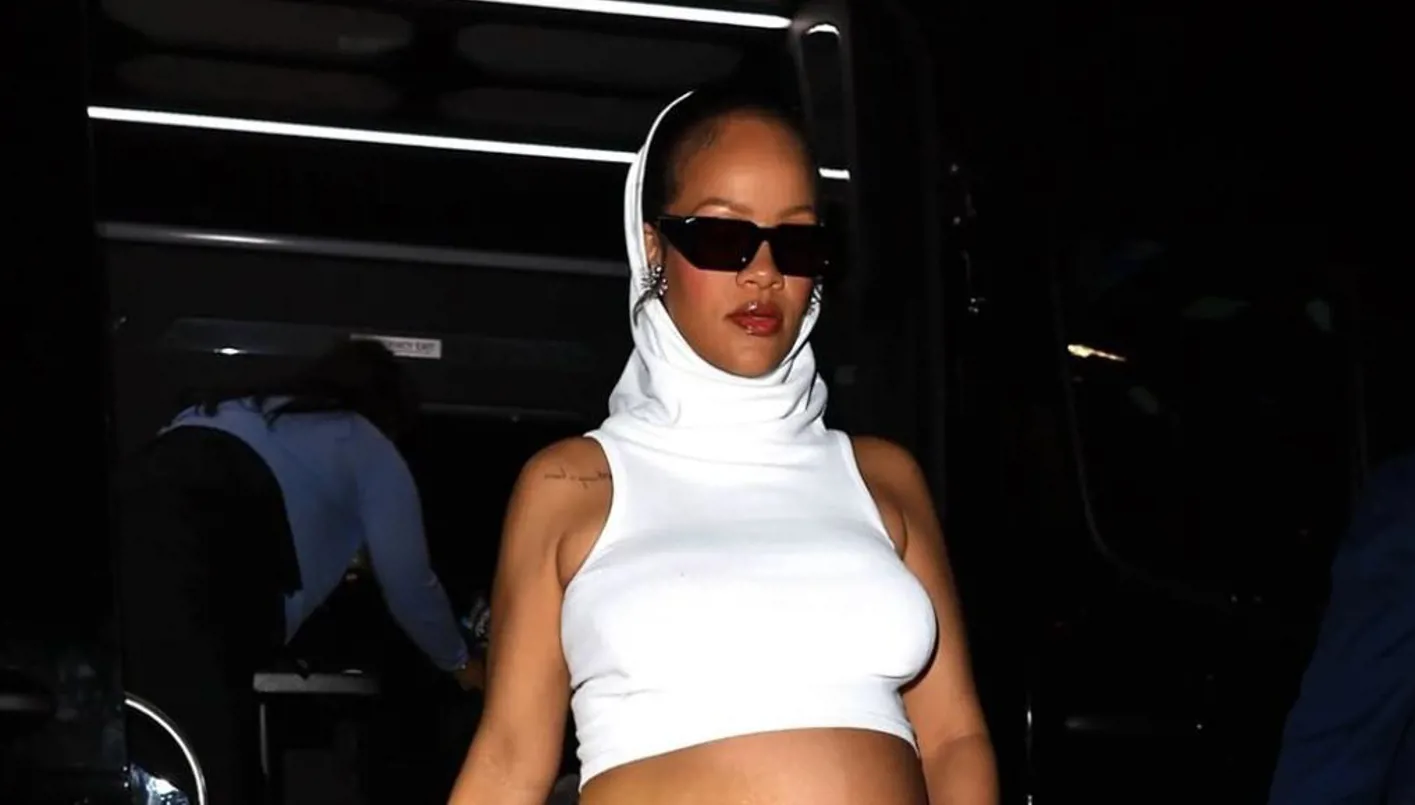 رُصدت إطلالة ريهانا وهي تخرج من مطعم جورجيو بالدي مـتأنّقة بالكامل باللون الأبيض من مجموعة شتاء 2025 من تصميم بيتر مولييه المدير الإبداعي لدار "علايا" (Alaia)، إذ ارتدت تنّورة طويلة وضيّقة تكشف الأشهر المتقدّمة من حملها، وهي مميّزة بتفصيل بارز عند أسفل البطن. وقد أكملت ريهانا إطلالتها مع "توب" قصيرة مع قلنسوة (Hooded Crop Top) مكمّلة للتنورة، وهي مكشوفة الكتفين بنمط "هالتر نك". كذلك، تزيّنت بمجوهرات ماسيّة من "بريوني ريموند" (Briony Raymond) وأساور من "جوزف سعيديان" (Joseph Saidian)، وانتعلت كندرة مدبّبة من الجلد الأبيض من "أمينة معادي" (Amina Muaddi).