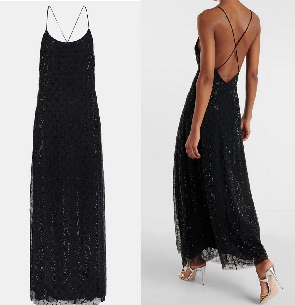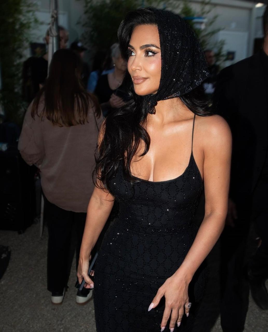 حظيت كيم باهتمام كبير من الباباراتزي بارتدائها فستاناً حاولت من خلاله تجسيد الأرملة السوداء المثيرة بنمط الـ "دولتشي فيتا"، إذ ارتدت فستاناً ضيّقاً معتدل الطول بدون كُمّيْن من الدانتيل الأسود الشفّاف مطبّعاً برموز دار Gucci البرّاقة، وتميّز الفستان بقصّة مكشوفة الصدر والظهر مع حمّالات رفيعة. ولإتمام مظهر المرأة الفاتنة، غطّت كيم شعرها بمنديل من نسيج مطابق لفستانها، ووضعت نظّارات سوداء، كما انتعلت صندلاً أسود بكعبٍ عالٍ.