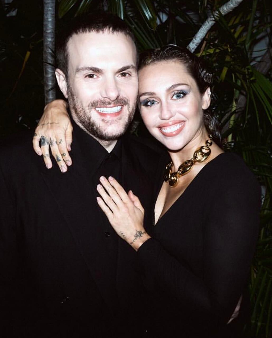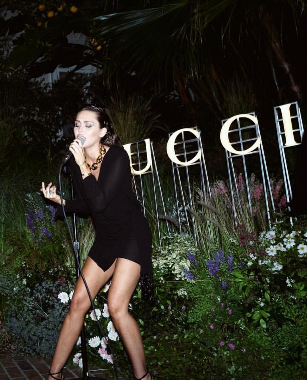 تألّقت مايلي سايرس خلال الحفل الذي أقيم حول بركة السباحة، وفي الصور التي التقطتها عدسات المصوّرين لها مع المدير الإبداعي ساباتو دي سارنو، بإطلالة كاملة من Gucci، شملت فستاناً أسود اللون، تميّز بقصّة قصيرة تعانق الجسم مع كُمّيْن طويليْن، ونمط الزمزمة التي ينسدل منها من جانب الخصر تفصيل يتجاوز طول الفستان، كما برز من خلال الصدر المكشوف حمّالة صدر من الدانتيل. كذلك، انتعلت مايلي صندلاً أسود وتزيّنت بعقد معدني يحمل رموز الدار الإيطالية العريقة.