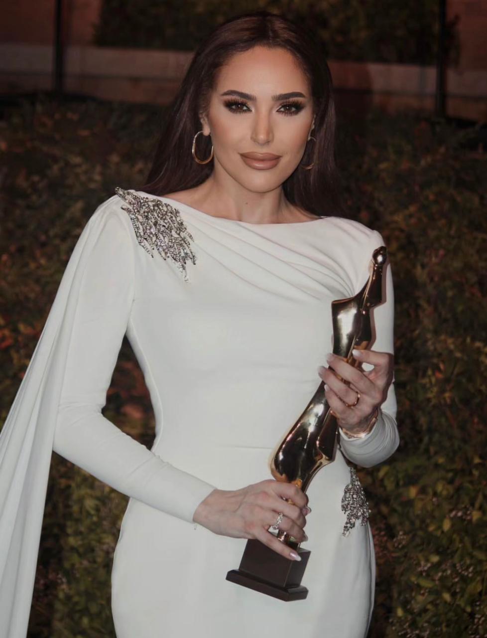 الفنّانة عبير نعمة تأنّقت بفستانٍ أبيض ذي كُمّيْن طويليْن، وقصّة تعانق الجسم مع ذيل طويل، وتفصيل مشلح ينسدل على طول الجانب الأيمن، وتطريز بالكريستال البرّاق يزيْن أحد الكتفيْن والخصر من الجانب الأيسر، اختارته لها خبيرة المظهر جوني متّى من المصمّم نجا سعادة. كذلك، تزيّنت عبير بمجوهرات من البلاتين المرصّع بالماس من Tiffany and Co.