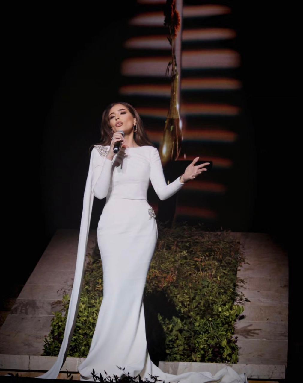 سارة أبي كنعان بدت مبهرة بفستانٍ من موسلين الـ"لوركس" الأبيض يتسم بالتأثير الهولوغرافي من تصميم اللبناني-العالمي رامي قاضي، تميّز بقصّة قصيرة تعانق الجسم مكشوفة الكتفيْن، وهو بنمط الزمزمة مع تفصيل طويل يلف الخصر وينسدل من الفستان ملامساً الأرض.