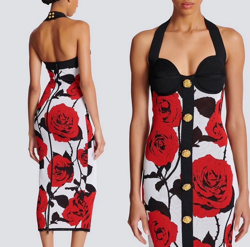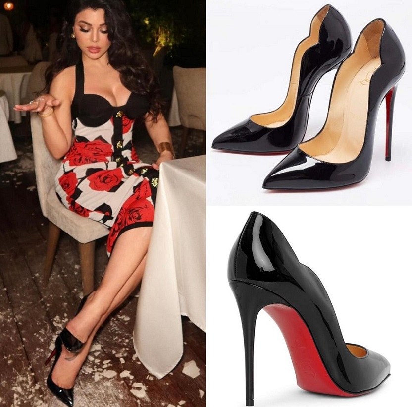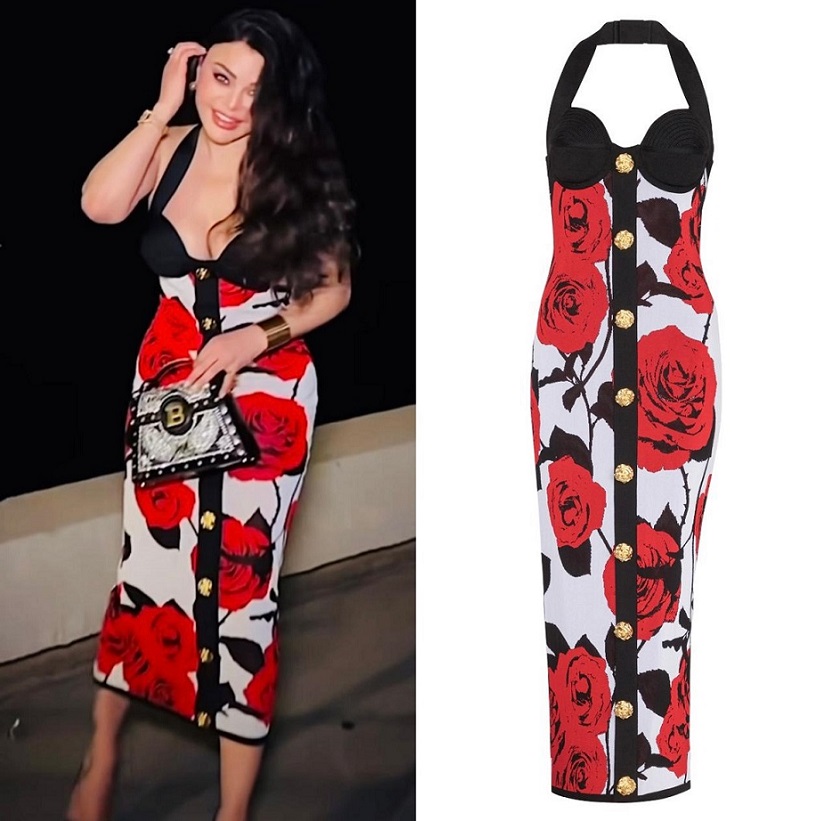 اختارت هيفاء التأنّق بفستانٍ مغرٍ من Balmain، وهو من أحدث صيحات الموضة وأكثرها رواجاً لهذا الموسم. إذ جاء باللون الأبيض المطبّع بالورود الحمراء الكبيرة وأوراقها السوداء، وهو مميّز بقصّة تعانق الجسم معتدلة الطول، مكشوفة عند الصدر والظهر مع حمّالات وصدريّة باللون الأسود بنمط "هالتر نك"، كما أنّه مزيّن بأزرار كبيرة ذهبيّة فوق شريط أسود يمتد على طول الفستان Halterneck Dress in Red Roses Jacquard Knit بقيمة 2,130$. كذلك، انتعلت الديفا كندرة مدبّبة من الجلد الأسود اللمّاع Black Patent Leather Hot Chick Pumps بقيمة 795$ من Christian Louboutin، وحملت حقيبة يد فاخرة من الساتان المنمّق بأحجار كبيرة من الكريستال B-Buzz Dynasty Bag in Embroidered Satin بقيمة 4,200$ من Balmain، كما تزيّنت بحلي من الذهب الأصفر مع ساعة يد مرصّعة بالماس.