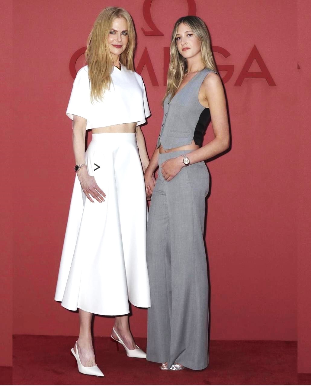 وكانت كيدمان قد اصطحبت ابنتها إلى فعاليّة "أوميغا" متألّقة باللون الأبيض من Maison Valentino، حيث ارتدت تنّورة بقصّة واسعة معتدلة الطول مع "توب" بكُمّيْن قصيريْن تكشف بطنها، وانتعلت كندرة مدبّبة مفتوحة من الخلف من الجلد الأبيض. أمّا ابنتها، فارتدت سروالاً رمادي اللون بقصّة مريحة، نسّقته مع "جيليه" من اللون نفسه بتفصيل السّاتان الأسود من الخلف، قصيرة وتكشف بطنها.
