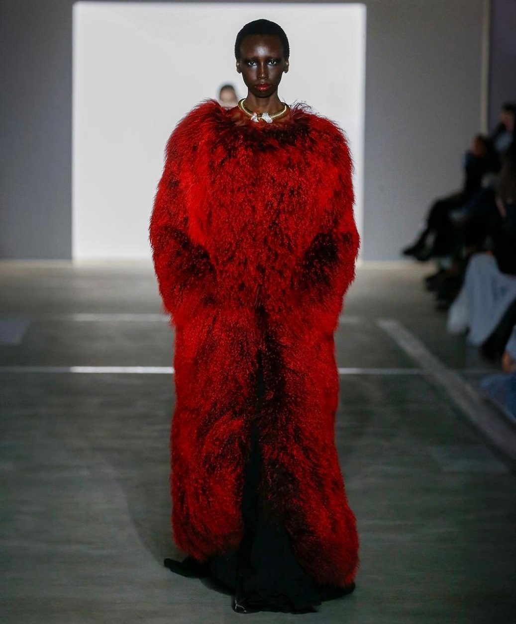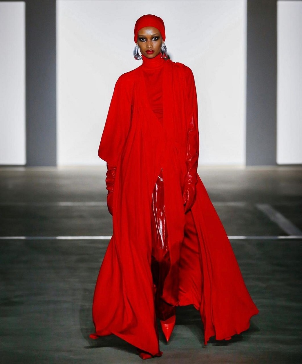 وبدت الفنانة مغرية بالصور التي نشرتها على "إنستغرام" وهي واقفة على سطح إحدى ناطحات السحاب، مرتدية بالكامل تصميماً مبهراً من مجموعة أزياء خريف وشتاء 2024 للمصمّم "برابال غورونغ" Prabal Gurung، شمل فستاناً طويلاً من الحرير بلون أحمر قرمزي، يعانق الجسم بنمط قفطان-الساري بقصّة منسدلة تكشف الصدر Vermillion Silk Cadie Draped Sari Kaftan أقرنته مع معطفٍ ضخم من جلد الغنم المنغولي باللونيْن الأحمر القرمزي والأسود Vermillion and Black Ombre Mongolian Shearling Coat، كما انتعلت كندرة مدبّبة من الساتان بلون فستانها، وزيّنت أذنيْها بقرطيْن ماسييْن.