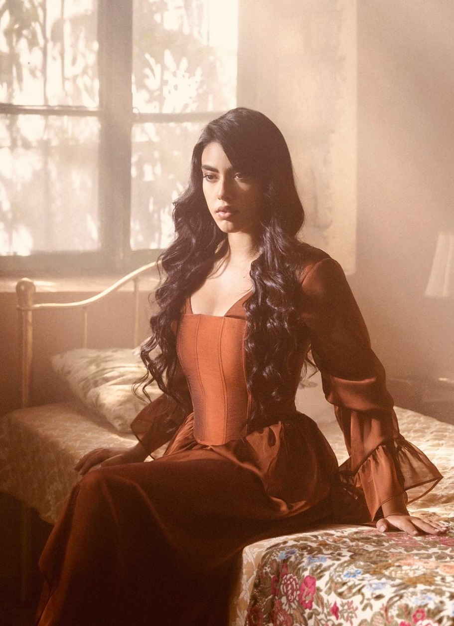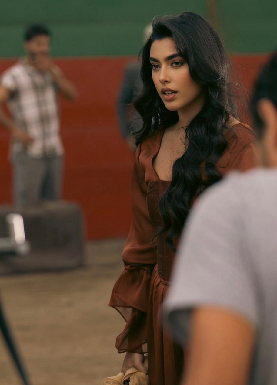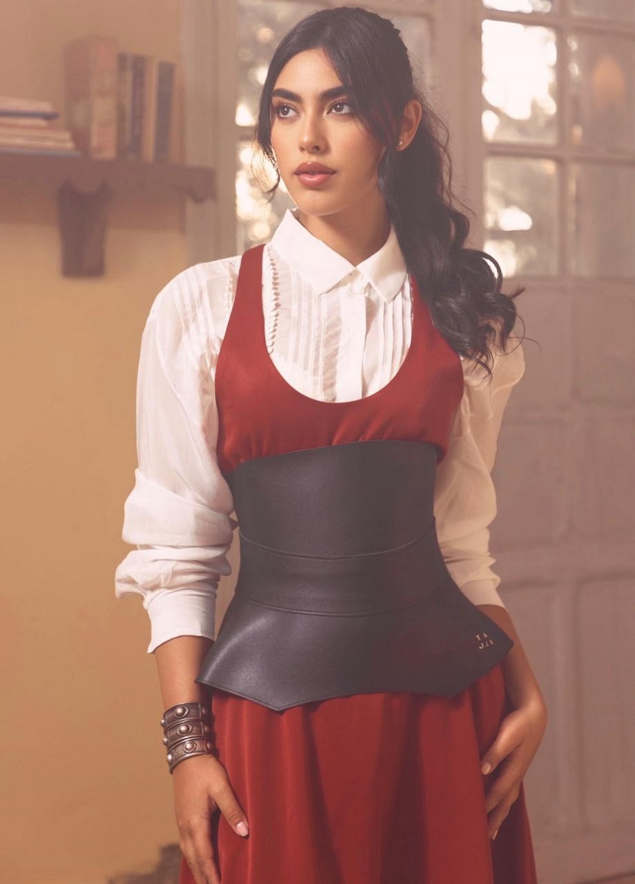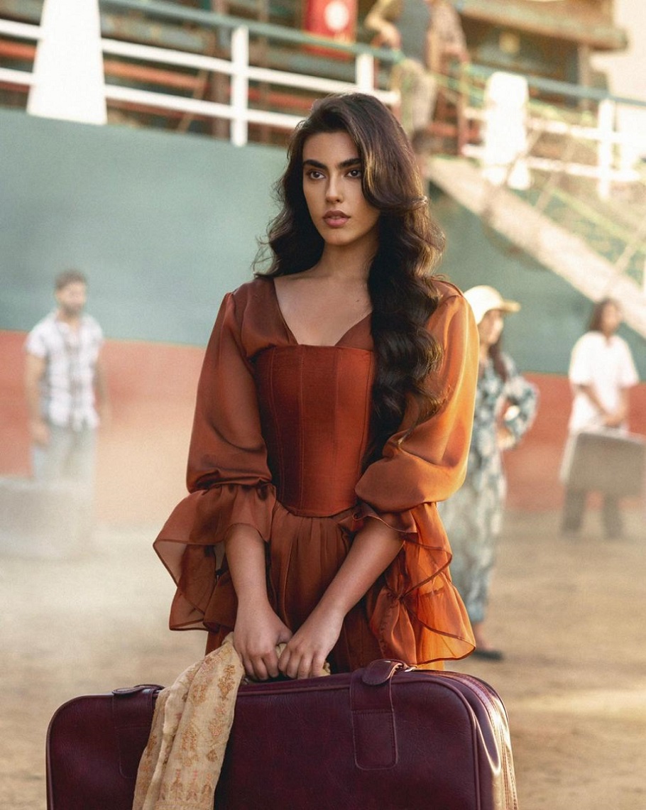 في إطلالة مختلفة، تأنّقت إيمان بفستان قرميدي اللون بنمط "هالتر نك" ذي ياقة عميقة وقصّة طويلة منسدلة، أقرنته مع قميص أبيض مزركش بتفصيل ثنيات صغيرة، وحدّدت خصرها بمشدّ عريض من الجلد البنّي من تصميم جوانا إندراوس، وتزيّنت بمجموعة من الأساور الفضيّة المعتّقة مشغولة يدوياً بالنمط الفلسطيني التراثي. وقد اعتمدت في هذه الإطلالة رفعة شعر "ذيل الحصان" مع فرق في الوسط، وأضيف على مكياجها خط رفيع جداً من الكحل المائي عند جذور الرموش العليا، وأحمر شفاه قشدي ذو لمعة طبيعيّة خفيفة بلون فستانها.