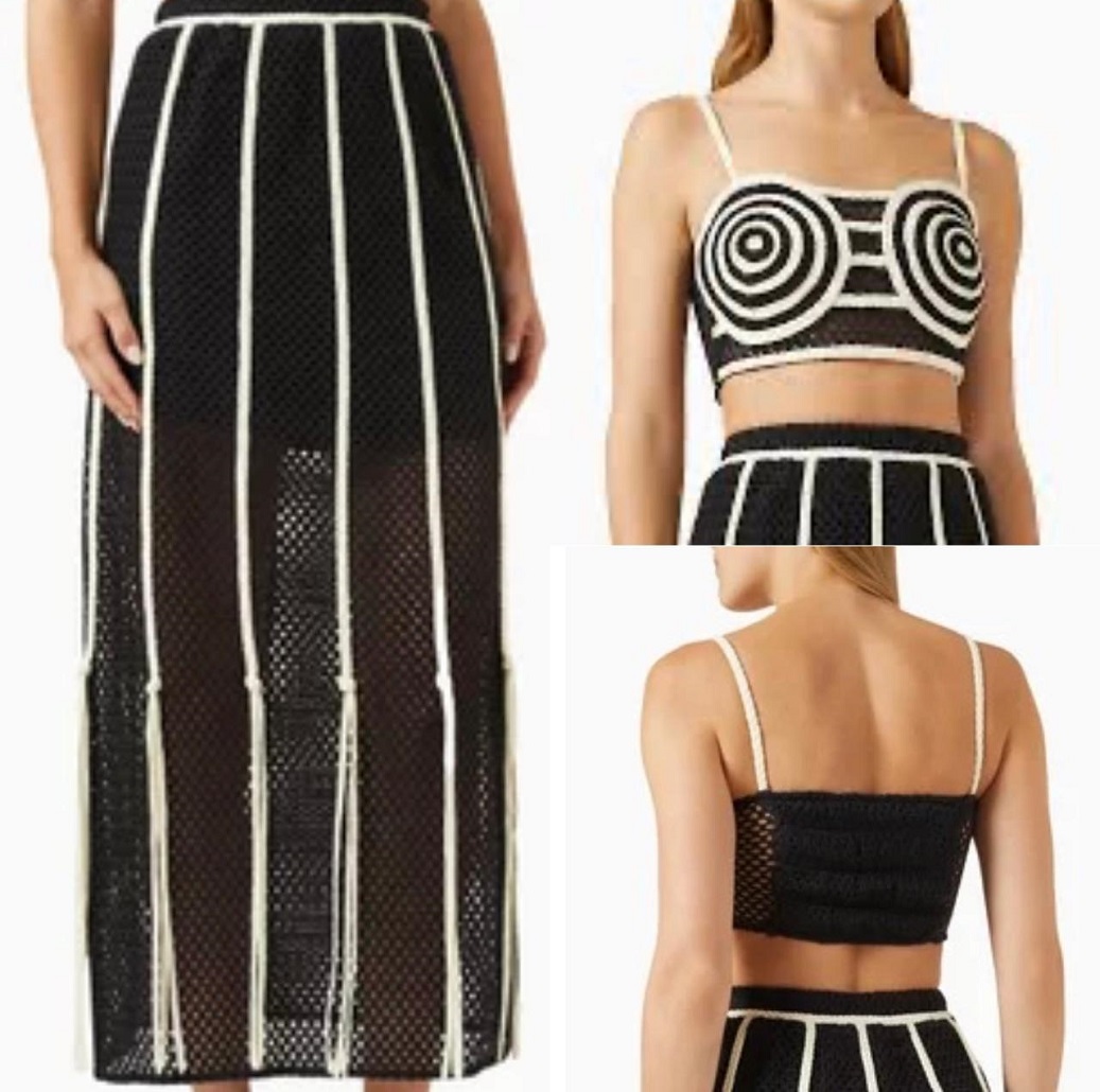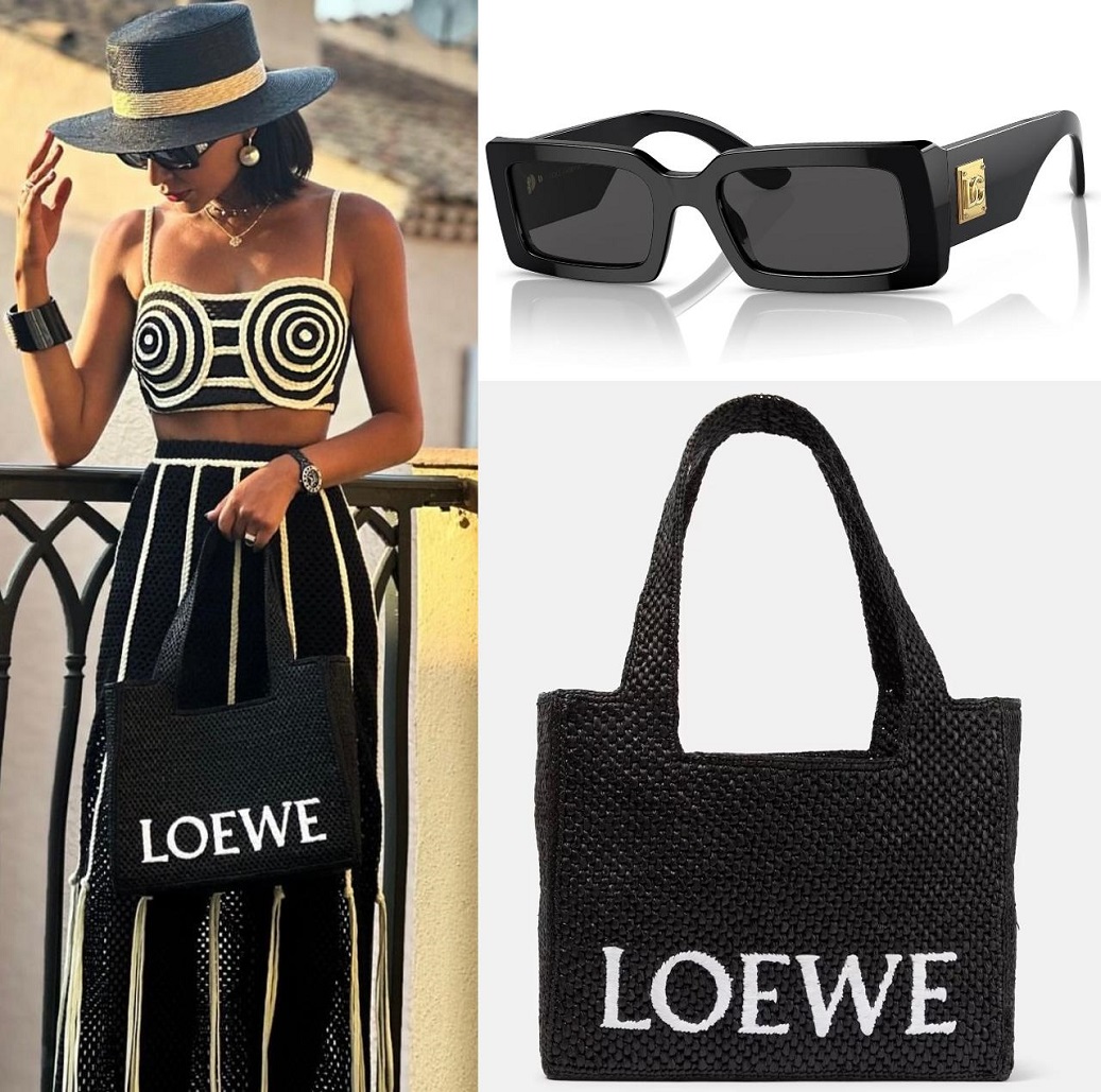 وقد ارتدت مهيرة تنّورة سوداء طويلة بقصّة منسدلة تعانق الجسم، وهي من القطن المحبوك تزيّنها عمودياً أربطة بيضاء Yasmeen Maxi Skirt in Cotton بقيمة توازي 1,530 ريالاً سعودياً بعد التخفيضات، أقرنتها مع "توب" بحبكة الصنّارة "كروشيه" مع حمّالات رفيعة بيضاء، وهي تكشف الصدر والبطن والظهر، ومصمّمة على شكل دوّامة حلزونيّة بلوني الأبيض والأسود Yasmeen Cropped Top in Crochet بقيمة بلغت 1,050 ريالاً سعودياً بعد التخفيضات، كلاهما من علامة Bouguessa. كذلك، زيّنت مهيرة أذنيْها بقرطيْن من اللؤلؤ الأبيض كروي الشكل، واعتمرت قبّعة سوداء من الرافيا مزيّنة بشريط عريض ساتيني عاجي اللون Woven CC Wide Brim Hat من Chanel، كما وضعت نظّارات سوداء DG 4416 Shiny BlackGrey Sunglasses بقيمة 283$ من Dolce & Gabbana، وحملت حقيبة كبيرة من الرافيا باللون الأسود Paula’s Ibiza Font Medium Raffia Tote Bag من Loewe بقيمة 1,095 يورو، وانتعلت صندلاً مفتوحاً من الجلد اللمّاع بكعب إسفين عالٍ Enya 75 Wedge Mules in Leather بقيمة بلغت 625 ريالاً سعودياً بعد التخفيضات من علامة Reformation.