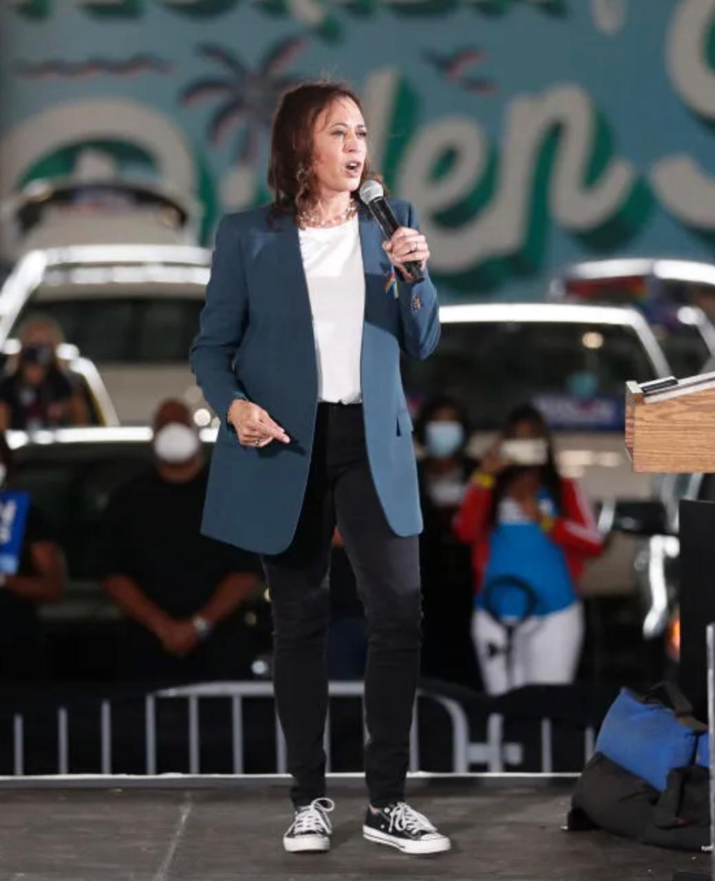 ورغم أن بدلاتها تعكس الاحتراف، فإن كامالا هاريس شهيرة أيضاً باختيارها للأحذية المريحة وغير الرسمية: أحذية "كونفيرس تشاك تايلور" Converse Chuck Taylor الرياضية. سرعان ما أصبح اختيار هذا النوع من الأحذية أيقونياً خلال حملتها لعام 2020، إذ يرمز إلى شخصيتها الواقعية وتعلّقها بالجذور وبناء روابط متينة مع محيطها. فصورة المرشحة لمنصب نائب الرئيس التي تجمع بين "وقار" البدلات الأنيقة و"بساطة" الأحذية الرياضية تركت صدى لدى العديد من الأميركيين، إذ عكست صورة الشخصيّة السياسيّة القوية والقريبة من الشعب في آن واحد، ما يمنح شعوراً بالأمان، ويطرح إمكانية الوصول إلى تلك الشخصيّة البارزة في مركز القوة بسهولة دون وجود تلك الحواجز الذي يبنيها عادة رجال السلطة.