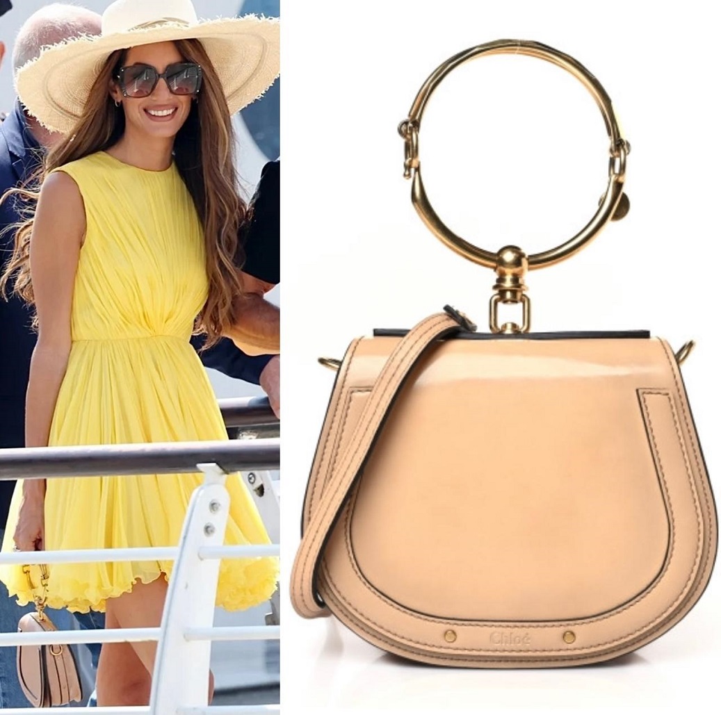 فستان أمل جاء بقصّة قصيرة جداً مع رقبة مستديرة وبدون كُمّيْن، وهو بتفصيل الزمزمة مع خصر محدّد وتنّورة منفوخة، انتعلت معه صندلاً مفتوحاً بنمط Peep-toes يكشف إصبعيْن من الجلد الحيادي اللون بكعب إسفيني وأربطة متشابكة تعانق سطح القدميْن، ووضعت نظّارات شمسيّة كبيرة سوداء اللون، كما اعتمرت قبعّة كبيرة من القش بلون عاجي مزيّنة بشريط بلون البيج الفاتح، ووضعت قرطيْن صغيريْن مرصّعيْن بالماس، كما حملت حقيبة يد فاخرة من الجلد بلون من الدرجات الحياديّة مع مقبض يشبه السّوار الكبير Patent Suede Small Nile Bracelet Bag بقيمة 949 دولاراً أميركياً من Chloe.