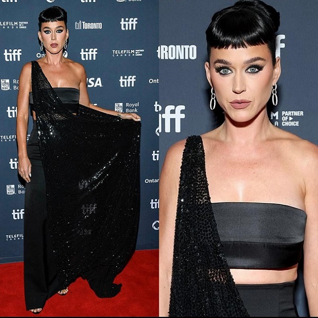 اختارت كاتي بيري تصميماً مميّزاً من علامة Celine الراقية يشبه نمط السّاري، شمل تنّورة طويلة من ساتان الحرير الأسود بقصّة ضيّقة بتفصيل شقّ على طول الجانب الأيمن لساقها، أقرنتها مع "توب" مكمّلة لها بدون حمّالات وتكشف البطن، ووشاح طويل منمّق بالترتر الأسود ينسدل من كتفها الأيمن على طول جسمها ليلامس الأرض. كما زيّنت بيري أذنيْها بقرطيْن من البلاتين المرصّع بالماس. كذلك، انتعلت صندلاً مفتوحاً بلون زيّها بكعبٍ عالٍ رفيع.