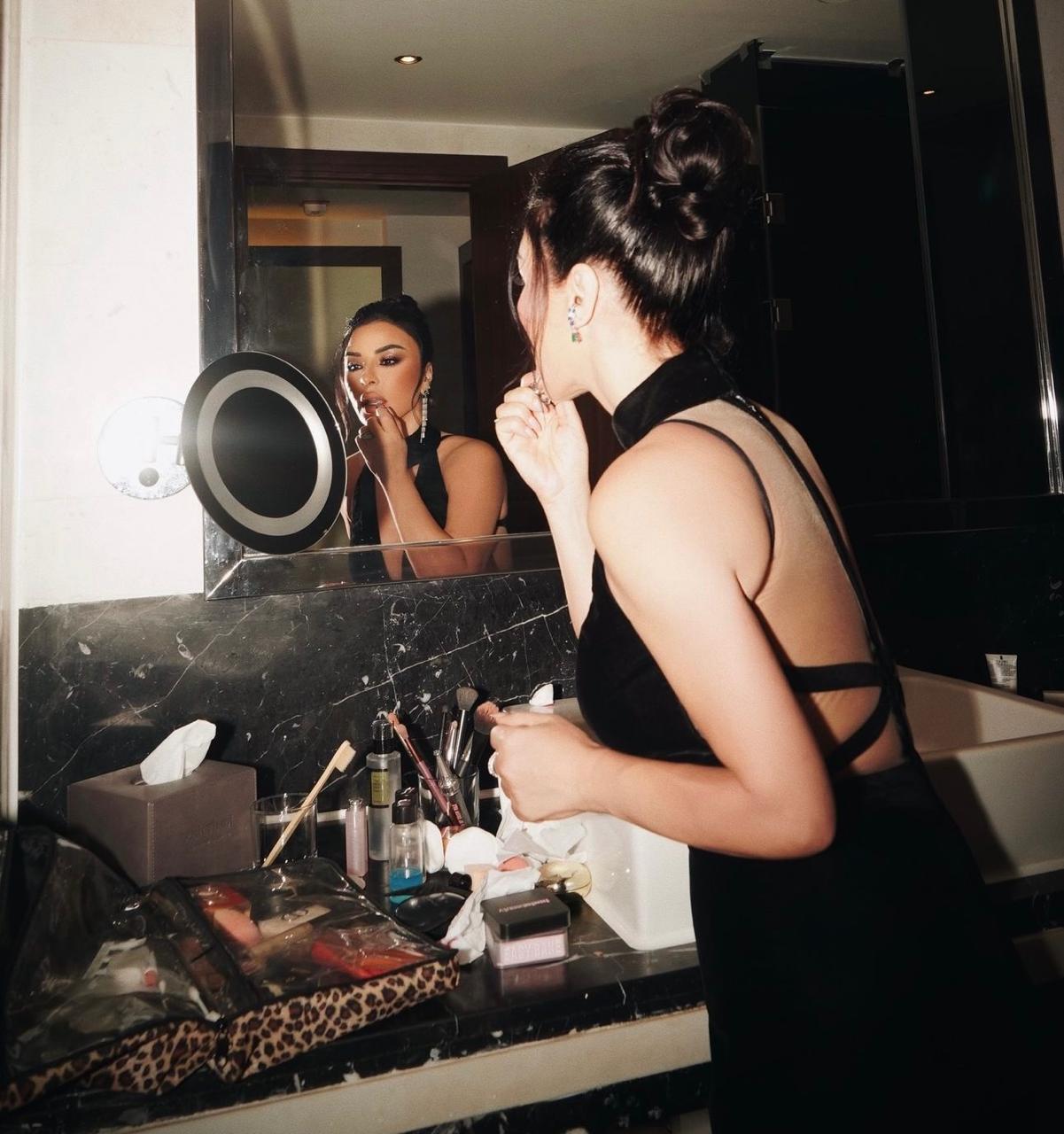 من الناحية الجماليّة، جاء مكياج ماغي بو غصن الذي نفّذه خبير التجميل المبدع داني كامل، بالنمط الدخاني المنفّذ بظلالٍ برونزيّة من درجات متفاوتة، كما حدّد العينيْن بالكحل المائي الأسود وماسكارا سوداء على الأهداب التي عزّزها بالرموش المستعارة، ونحت ملامحها بلمسات البودرة البرونزيّة وهايلايتر خفيف عند أعلى الوجنتيْن، وغلّف شفتيْها بلون البيج الحيادي بعدما حدّدهما بقلم من اللون نفسه. أمّا تسريحة شعرها بلمسة مصفّف الشعر ميشال ليّون، فهي بنمط شينيون مشدود إلى أعلى مع كعكة مصقولة، وخصلة رفيعة تنسدل من الجانب الأيسر لوجهها.