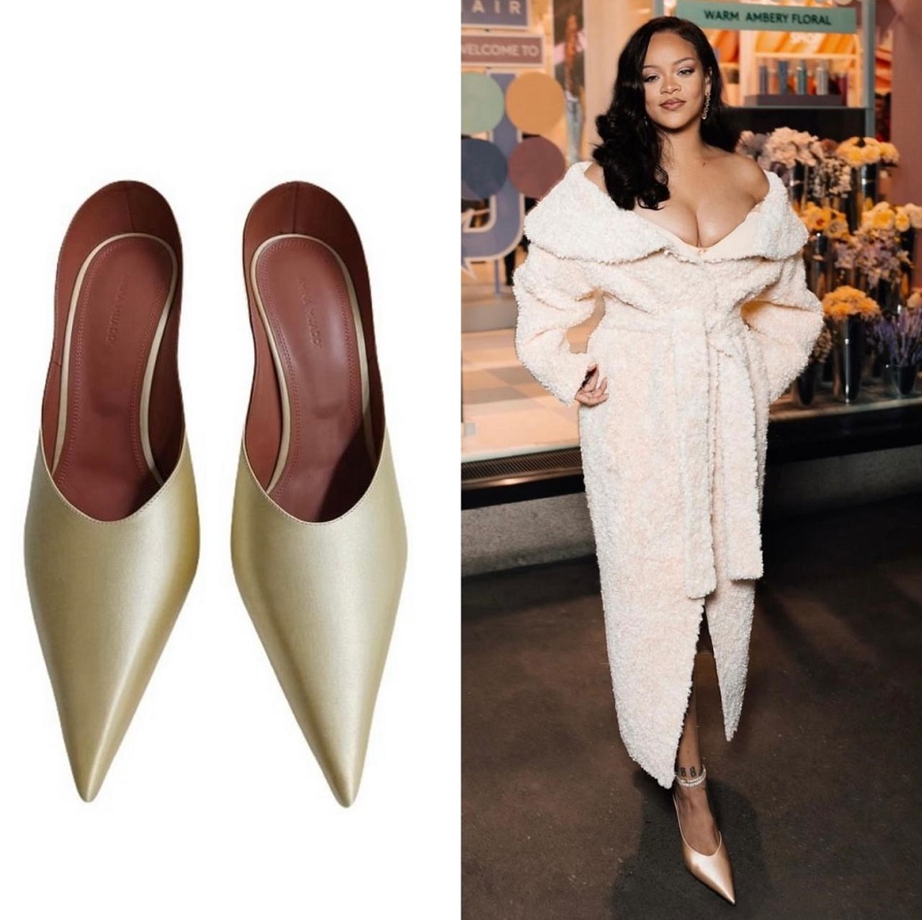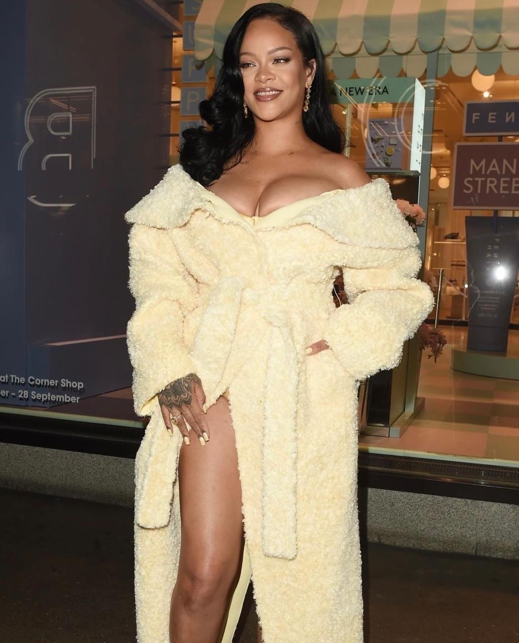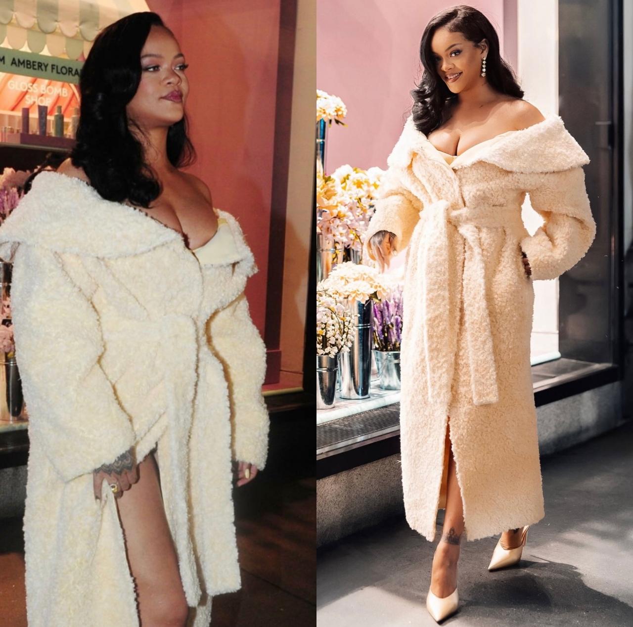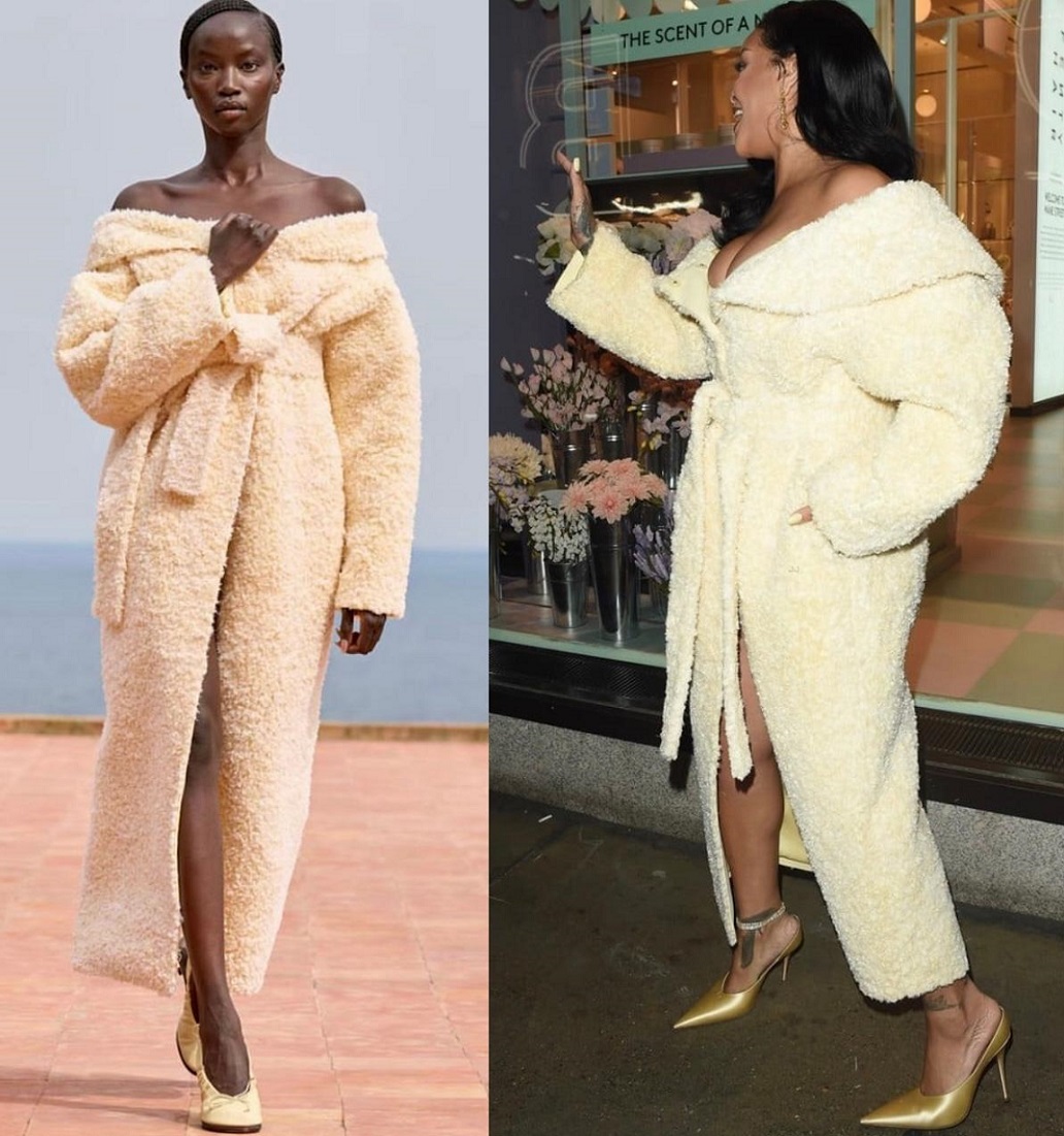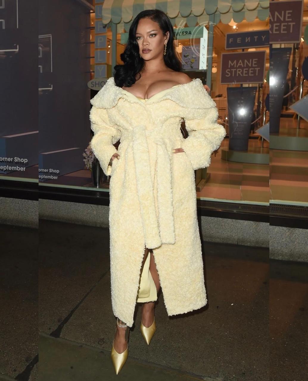 تألّقت ريهانا بمعطف طويلٍ وضخم، محدّد بحزامٍ معقود حول الخصر عاجي اللون، ومكشوف الكتفيْن من صوف الخروف اختارته من مجموعة الألبسة الجاهزة لخريف وشتاء 2024 من علامة Jacquemus، وقد عمدت إلى فتحه بشكل مغرٍ يكشف ساقيْها، وأقرنته مع كندرة مدبّبة من الساتان بلون بيج ذهبي من علامة Amina Muaddi، كما تزيّنت بمجوهرات مرصّعة بالماس.