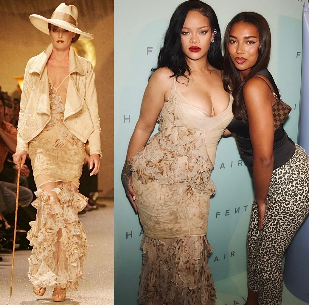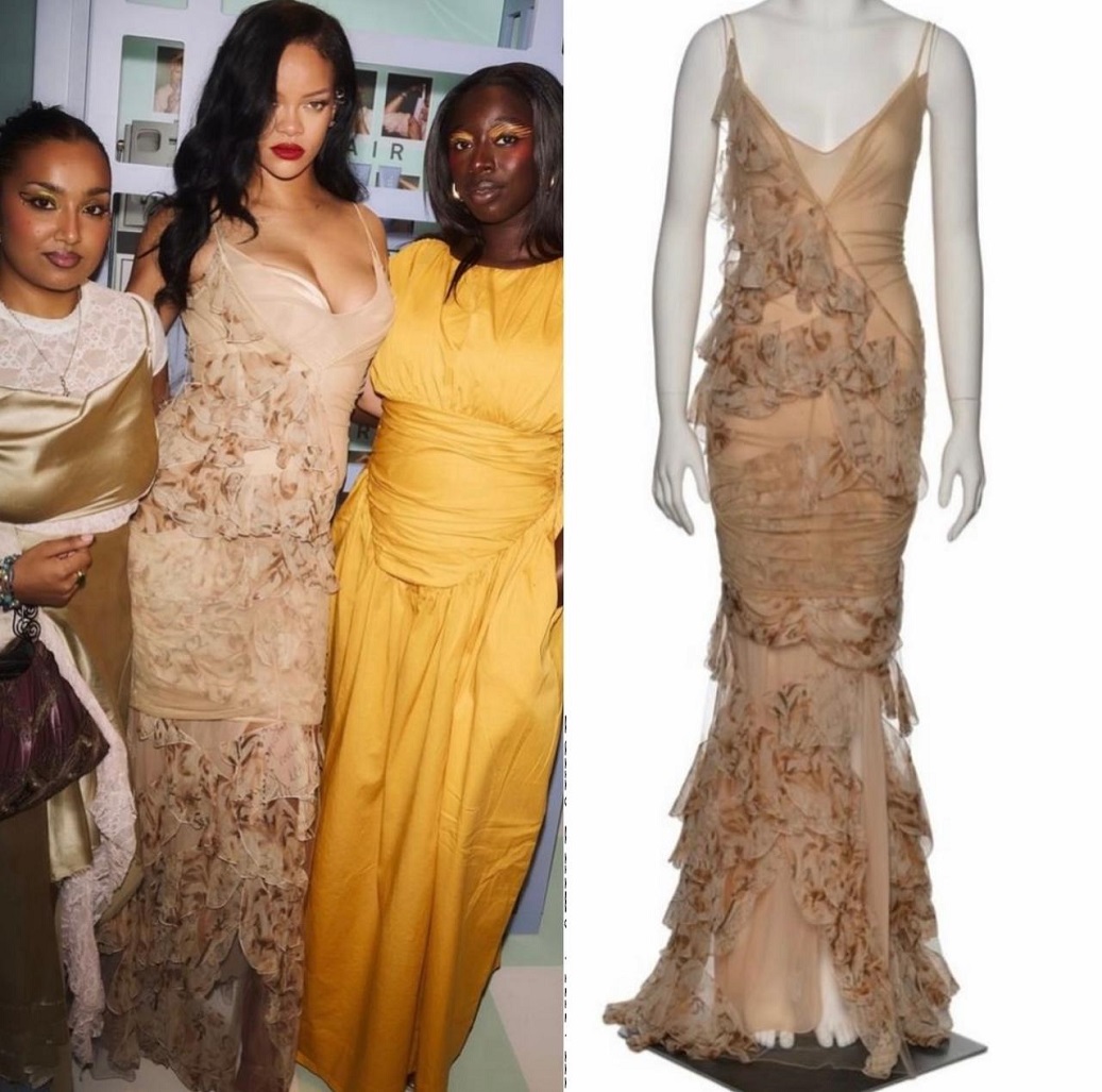ولاحقاً، ارتدت "ريري" فستاناً من الحرير والتول بلون حيادي مطبّع بالورود وبنمط الكشاكش من تصميم قديم لـ "جون غاليانو" John Galliano، ورغم إبقائها على المكياج نفسه إلّا أنها غلّفت شفتيْها باللون الأحمر المغري.