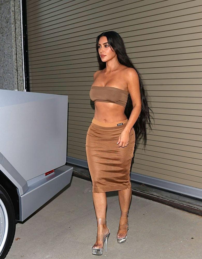 ورغم امتلاكها لعلامة SKIMS المشهورة بنوعيّة أقمشتها المريحة والتي تُجمّل شكل الجسم بشفافيّة وراحة تامة، إلا أن كيم بدت فاتنة في أحدث إطلالة لها رصدتها عدسات الباباراتزي بينما كانت تغادر مسقط رأسها في كالاباساس، حيث إنها فضّلت التأنّق بتنورّة بلون الكابوتشينو معتدلة الطول تعانق السّاقيْن من علامة Miu Miu وهي مميّزة بتفصيل يبرز عند الخصر كأنّه جزء من الملابس الداخليّة دُوّن عليه اسم العلامة الإيطاليّة من الجانب الأيسر، ونسّقت التنّورة مع "توب" بنمط حمّالة الصدر من النسيج المطّاط بلون التنّورة من علامة SKIMS، وانتعلت كندرة شفّافة بتفصيل حزامٍ عريض يغطّي سطح القدم وآخر يعانق الكاحل شفّاف أيضاً، أمّا الكعب الشاهق فجاء باللون الفضّي الذي يحاكي لون منصّة الكندرة الضخمة، وهي من مجموعة أحذية قديمة تمتلكها كارداشيان.