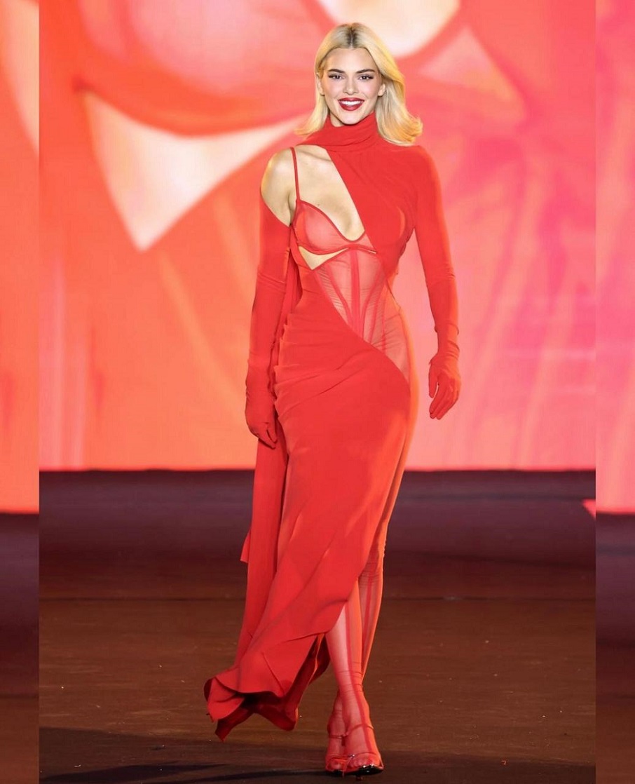 كيندال البالغة من العمر 28 عاماً، والأخت الصغرى في عائلة كارداشيان، تألّقت بفستان أحمر ذي قبّة عالية من "تييري موغلر" Thierry Mugler، تميّز بقصّة طويلة تعانق الجسم ومنسدلة بأسلوب غير متماثل، وهو بتفصيل شق يكشف السّاق اليسرى، ومقرون بقفّازيْن طويليْن، ويبرز تحت الفستان تصميم شفّاف يغطي كامل الجسم ويبرز على شكل "كورسيه" ينحت الصدر، كما انتعلت صندلاً من اللون نفسه.
